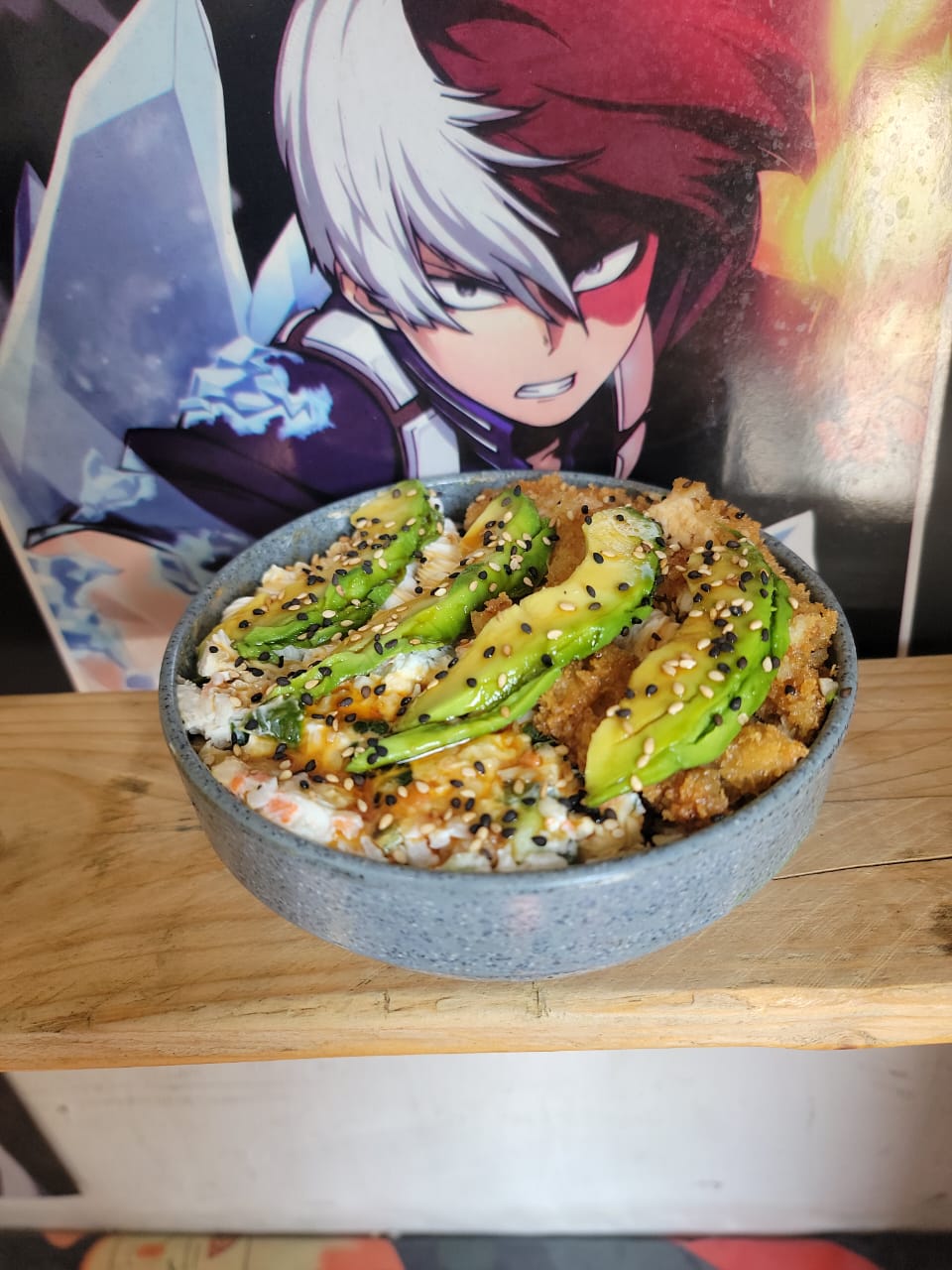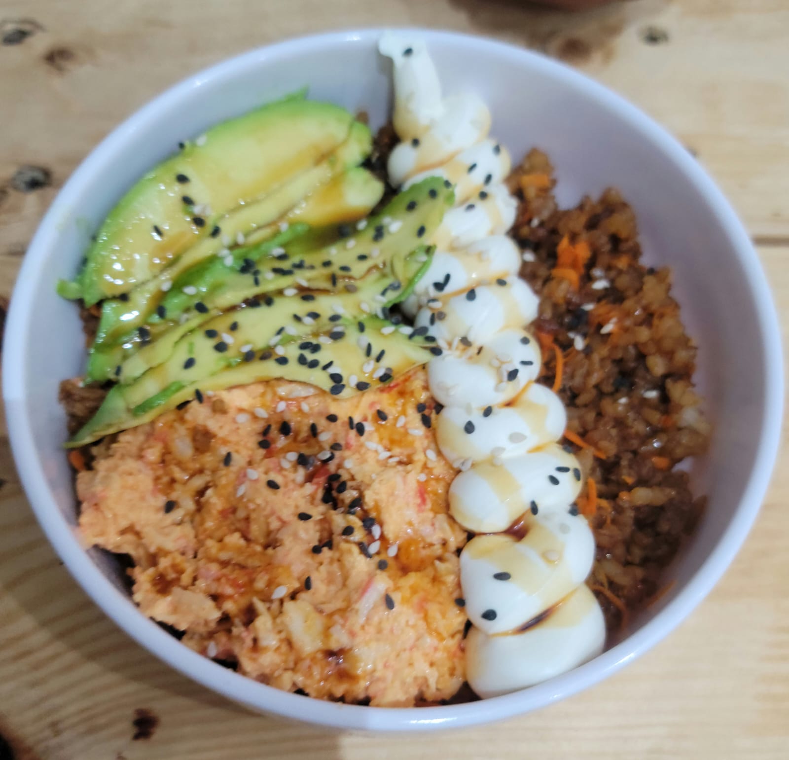 Tazón de arroz blanco con ensalada de surimi, philadelphia, aguacate, anguila y ajonjolí.