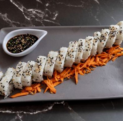 Rollo natural relleno de alga, philadelphia, pepino, aguacate y surimi. Escarchado con ajonjolí.