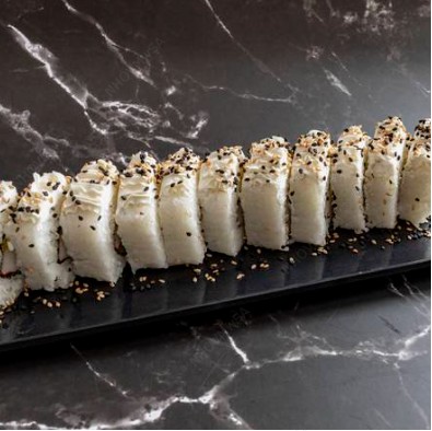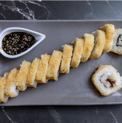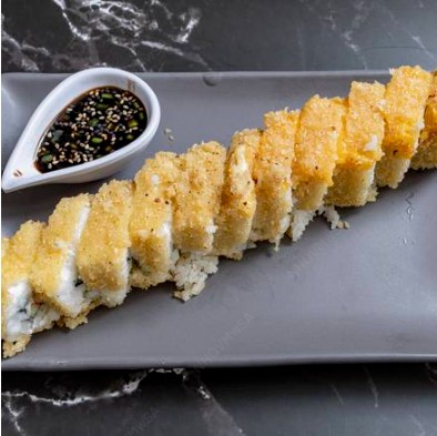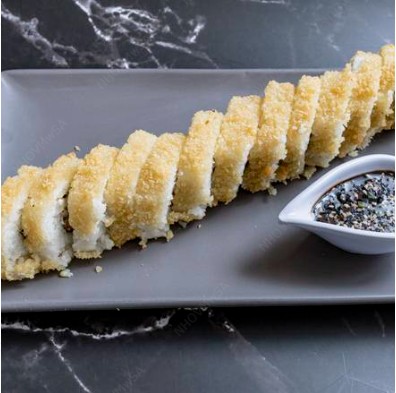 Rollo empanizado relleno de alga, philadelphia, aguacate, pepino y surimi.