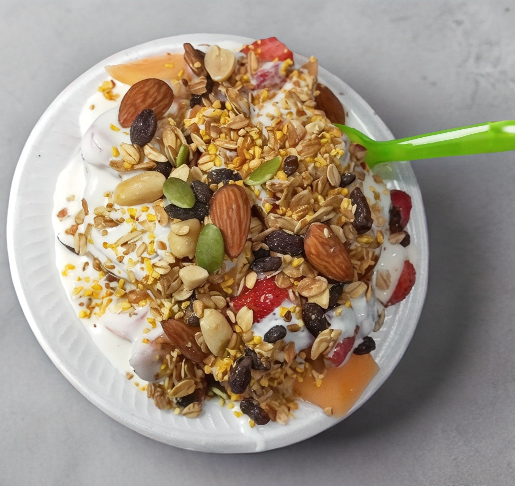 Fruta mixta platano manzana papaya melon. Chino fresa crema artesanal y cerelaes. A elección