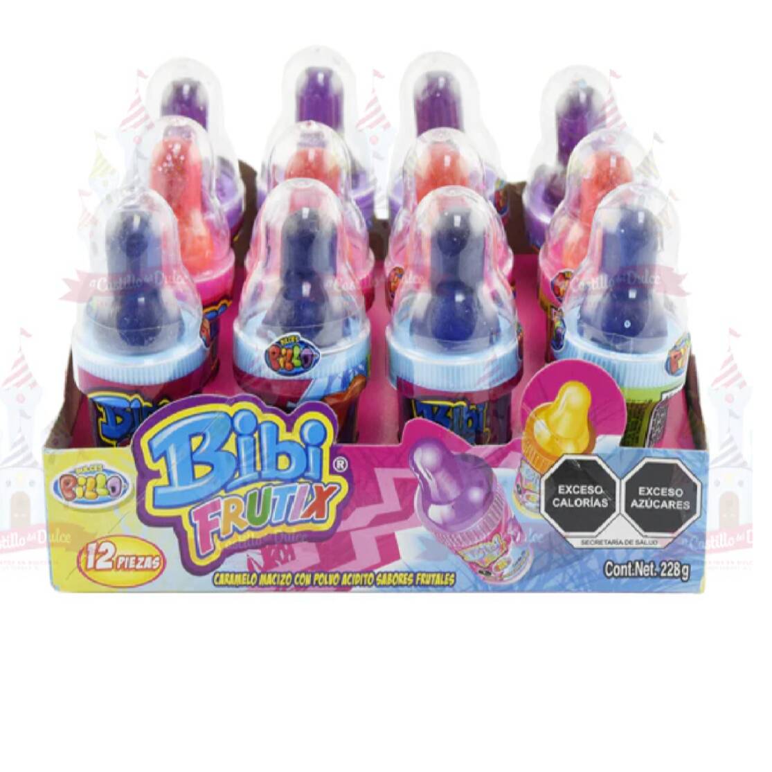 bibis de paleta y caramelo azucarado con sabores surtidos 12pz
