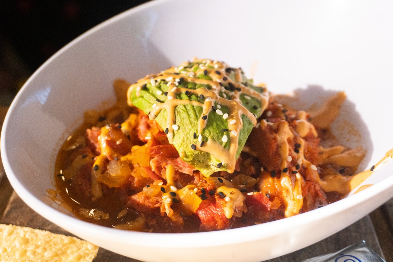 Rellena de Marlín, guisada con el estofado de la casa y coronados con aderezo de chipotle y cilantro.