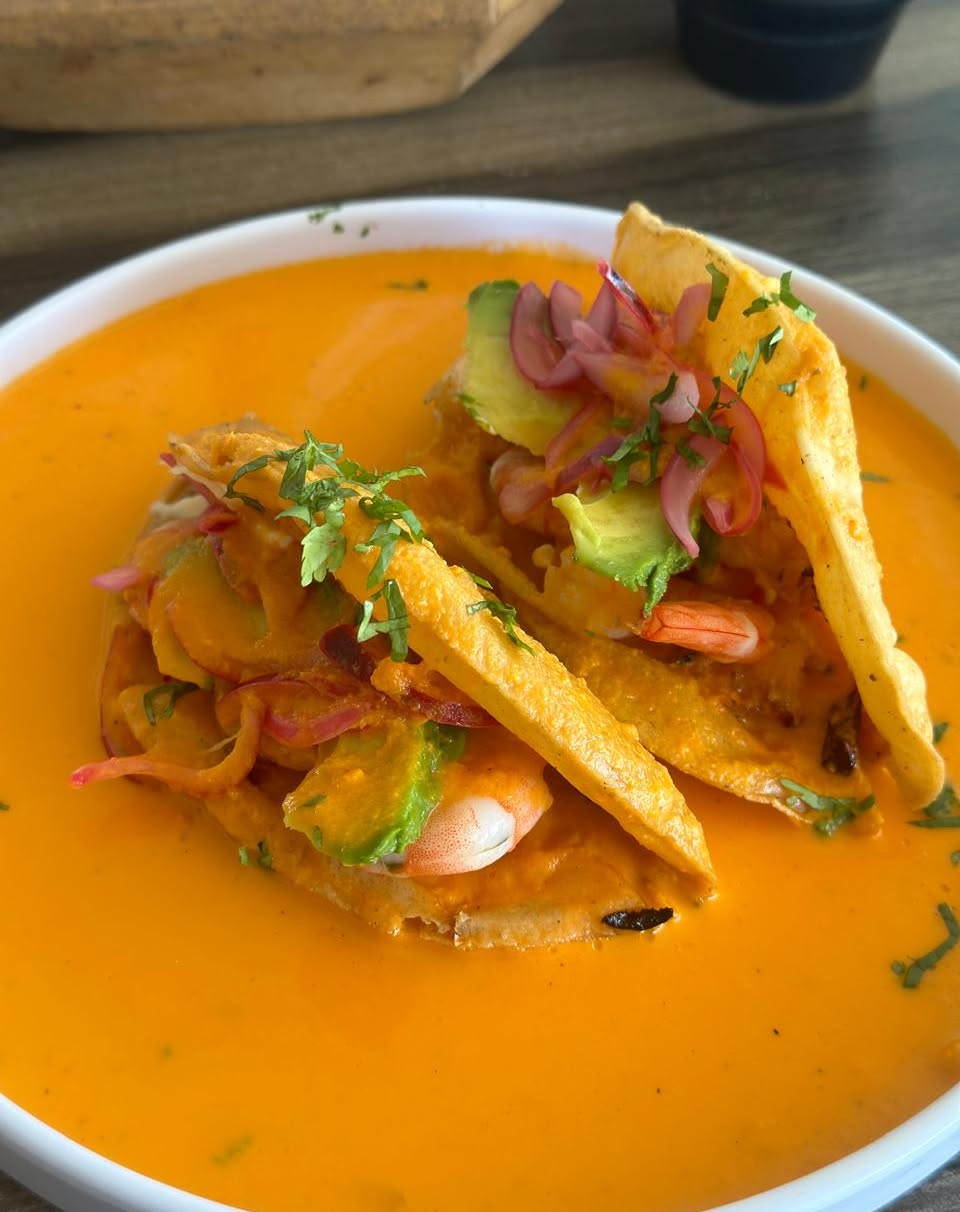 Rellena de pescado, guisados con el estofado de la casa y coronados con aderezo de chipotle y cilantro.