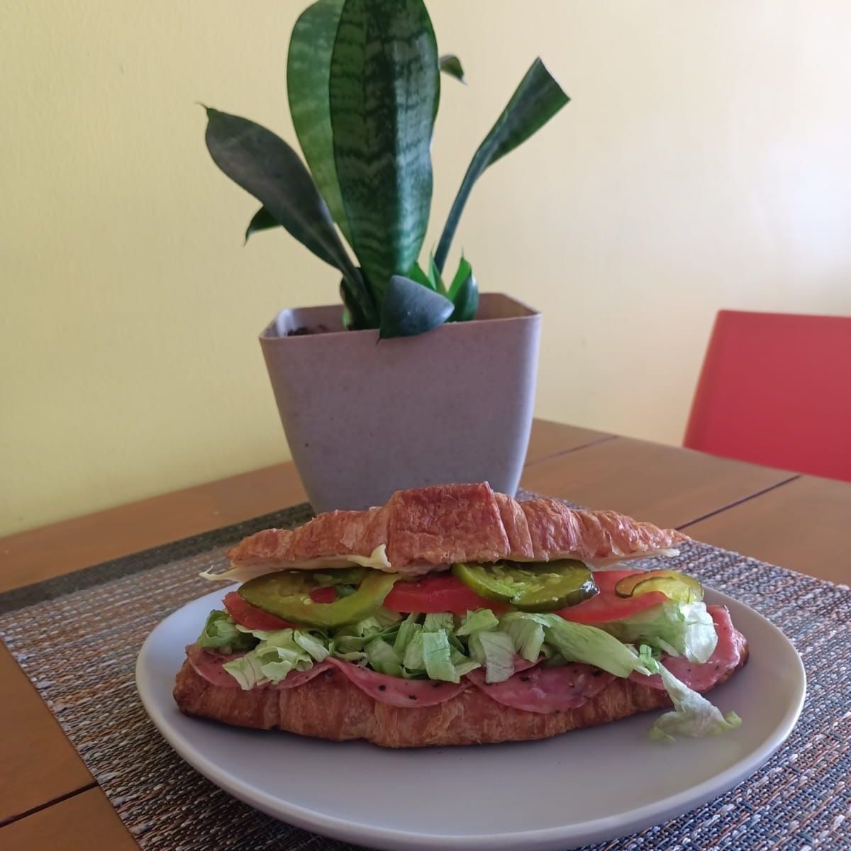 Croissant natural con aderezo a elegir, las carnes frías de tu preferencia, queso manchego, lechuga, tomate y pepinillos
