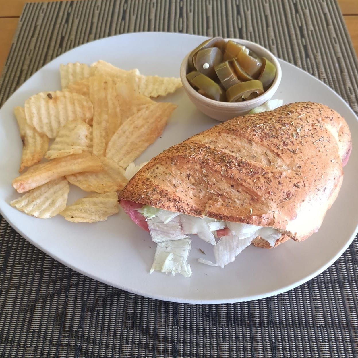 Pan artesanal (24cm) con aderezo a elegir, las carnes frías de tu preferencia, queso manchego, lechuga, tomate y pepinillos
