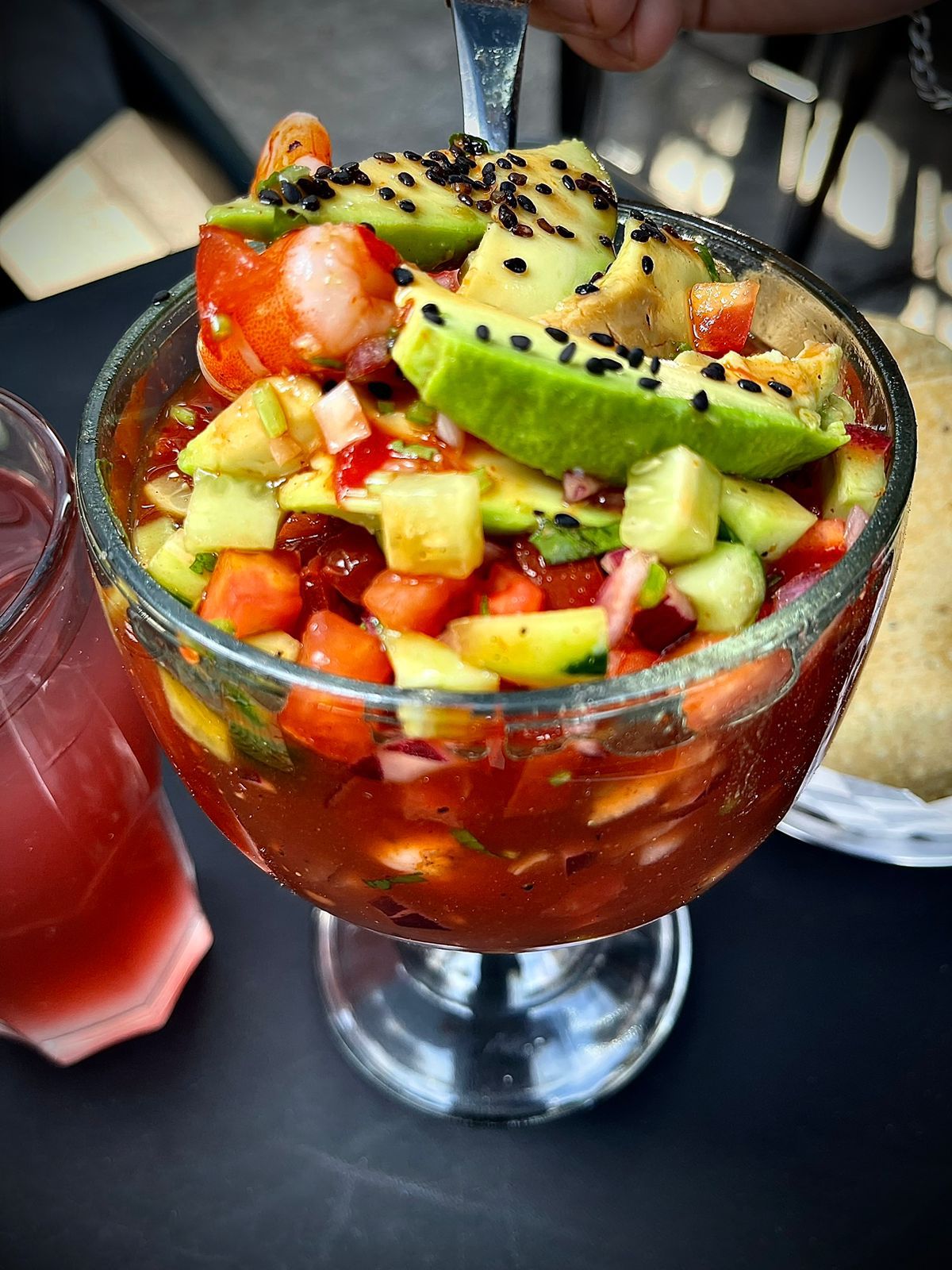 HECHO A BASE DE CAMARÓN COCIDO PREPARADO CON ENSALADA MEXICANA, SALSAS NEGRAS DE LA CASA Y CLAMATO, AGUACATE Y TOSTADAS