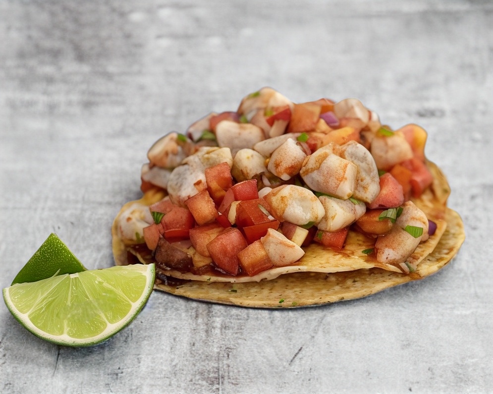 TORTILLA DE TAMAÑO NORMAL FREIDA CON CAMARON Y PICO DE GALLO
