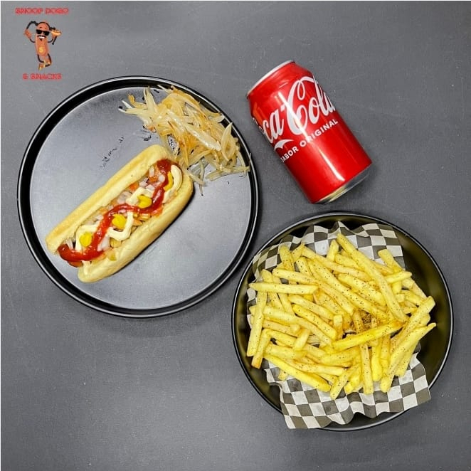 hot dog de res acompañado con papas a la francesa y una coca cola