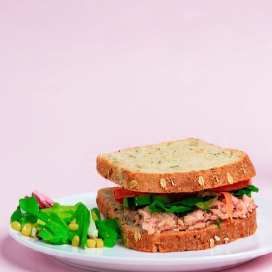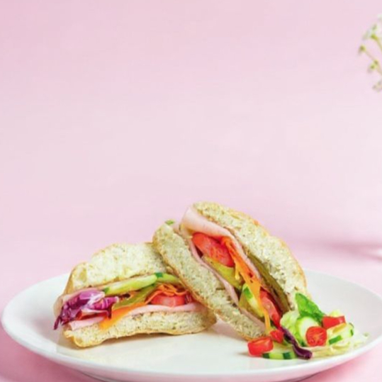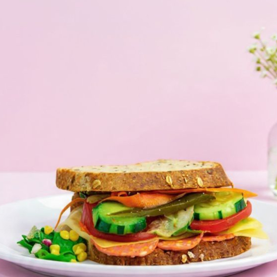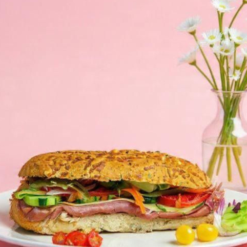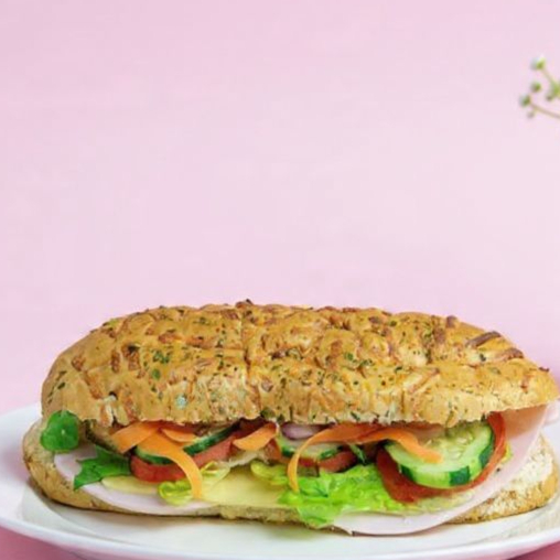 Baguette de Pechuga de pavo con queso. Acompañado de lechugas mixtas, zanahoria, pepino, cebolla morada y chile