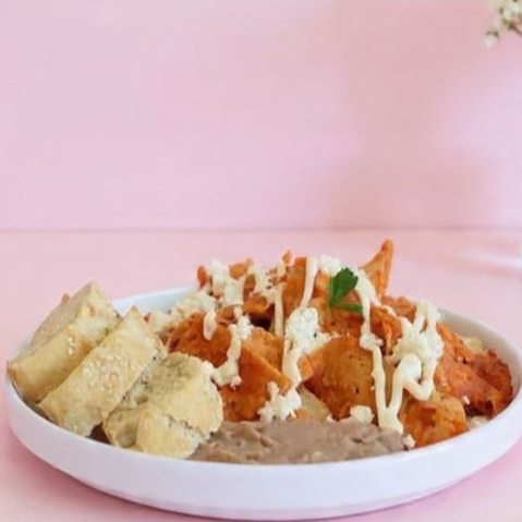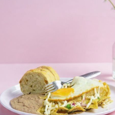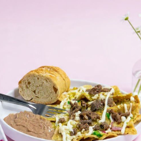 Exquisitos chilaquiles acompañados de frijoles refritos y bolillo con crema, queso y cebolla. Favor de indicar si gustan sus chilaquiles crujiemtes con todo por separado o ya preparados?
