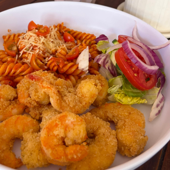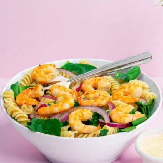 Pasta Fusili, Camarón, Espinacas, Cebolla Morada y Aderezo.