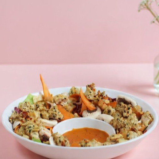 Deliciosa ensalada con pollo, lechuga italiana, lechuga romana, champiñones, col morada, zanahoria, crotones y aderezo.