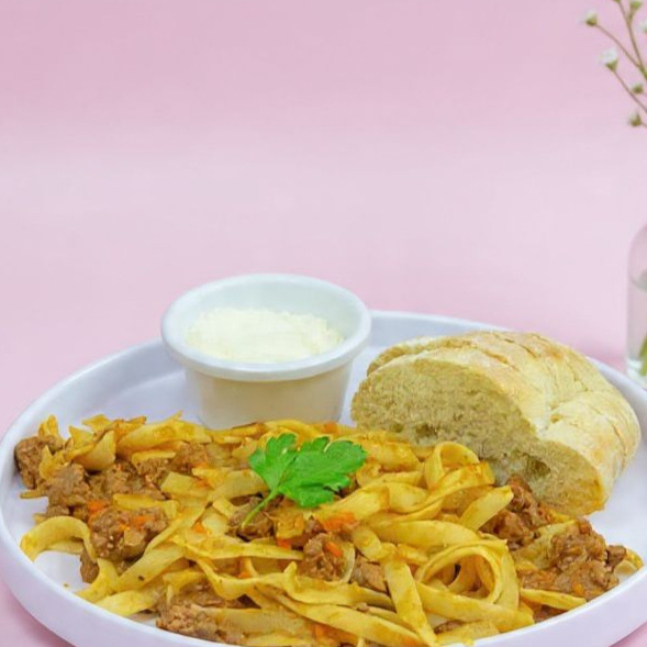 Pasta a la Bolognesa. Acompañada de Pan Artesanal y Queso Parmesano