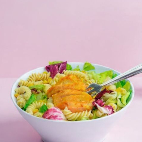Pollo, Pasta Fusili, Elote y Lechugas Mixtas.