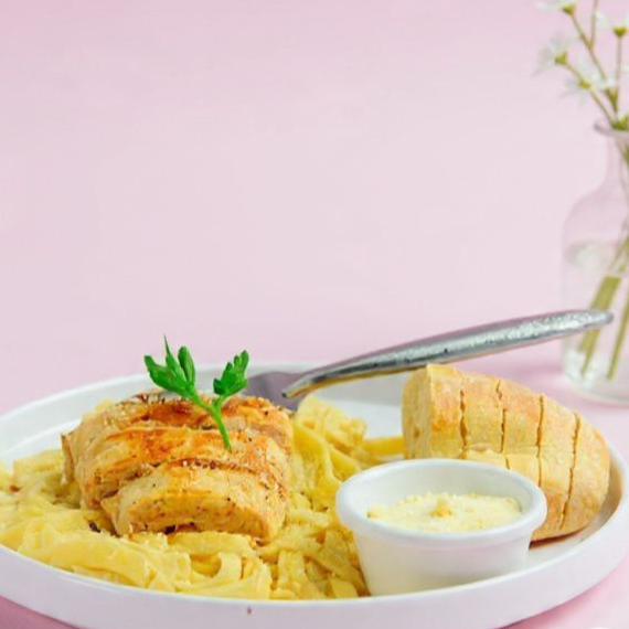 Pasta en Salsa Alfredo. Acompañada de Pollo, Queso Parmesano y Pan Artesanal