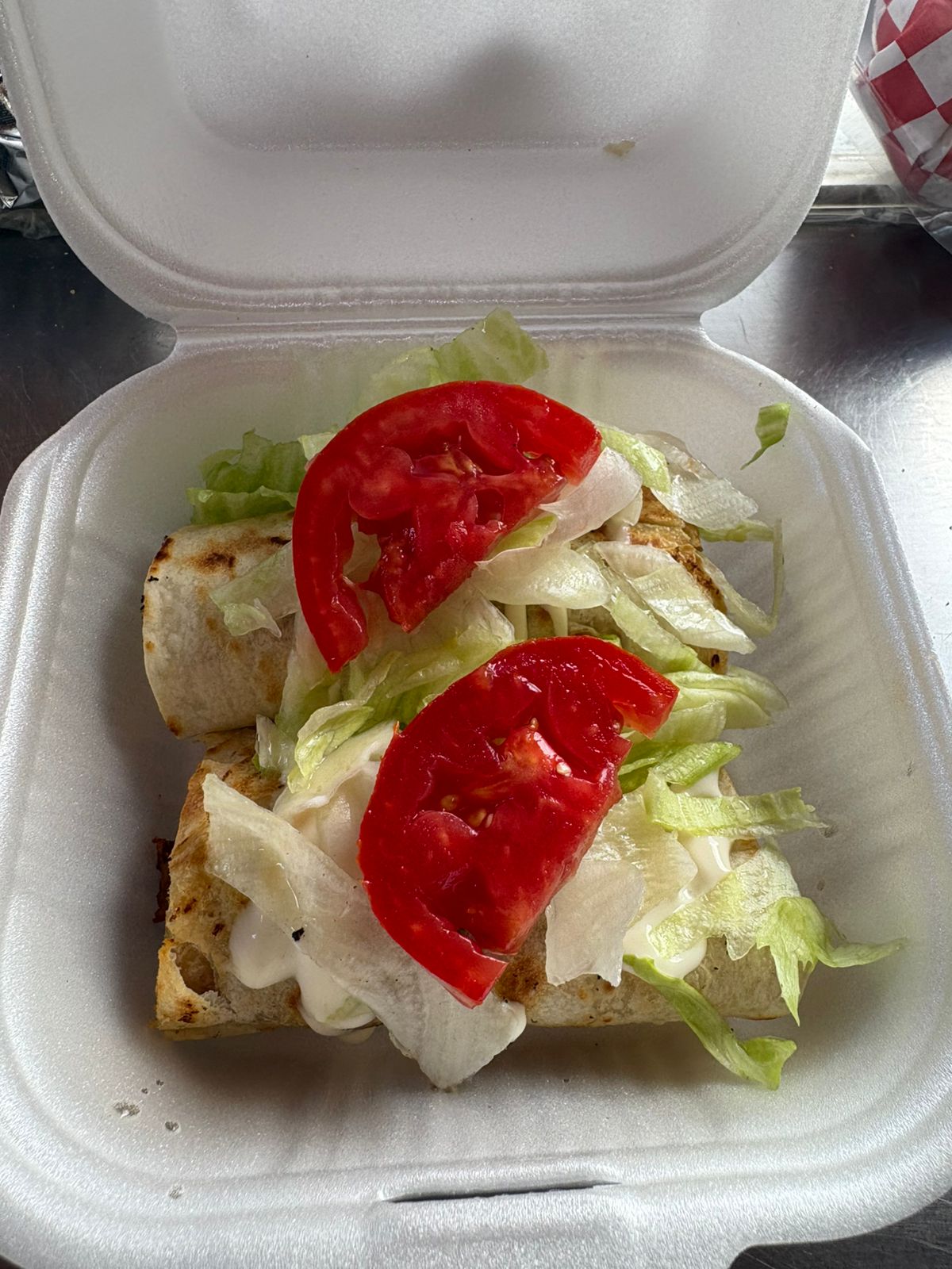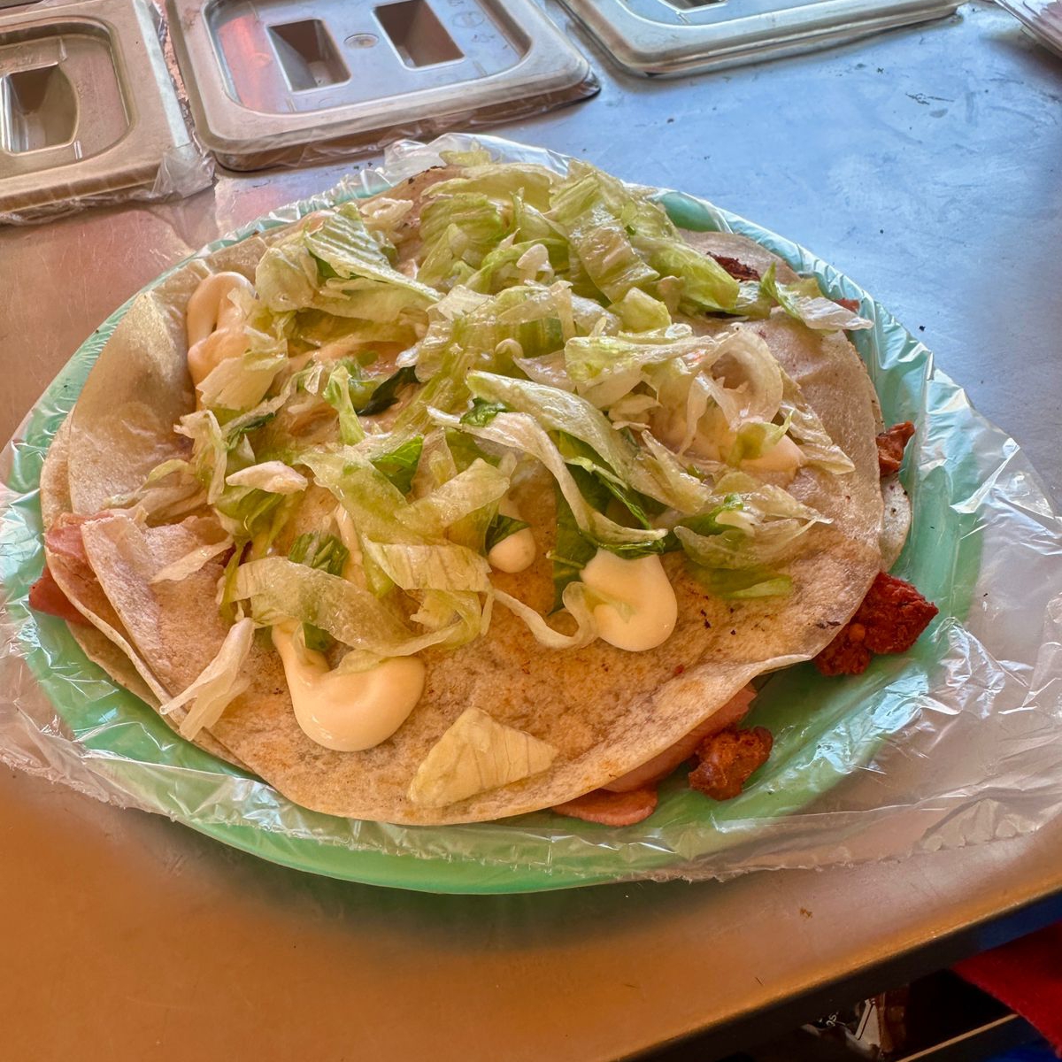 Tortilla de harina calientita rellena de pastel r, acompañado de lechuga, jitomate, cebolla, crema, catsup y mostaza