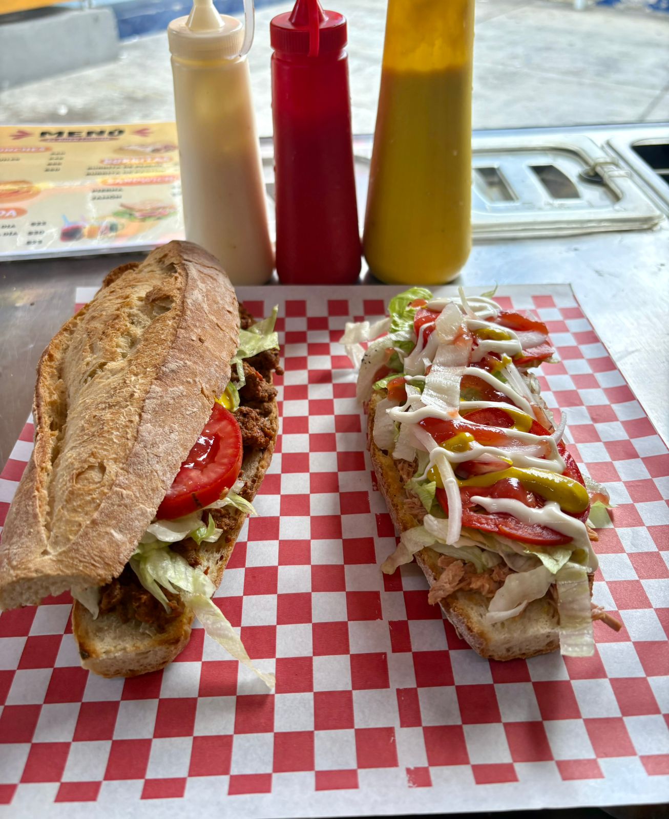 Pan suavecito y calientito, acompañado de panela fresca, con lechuga, jitomate, cebolla, crema y mostaza