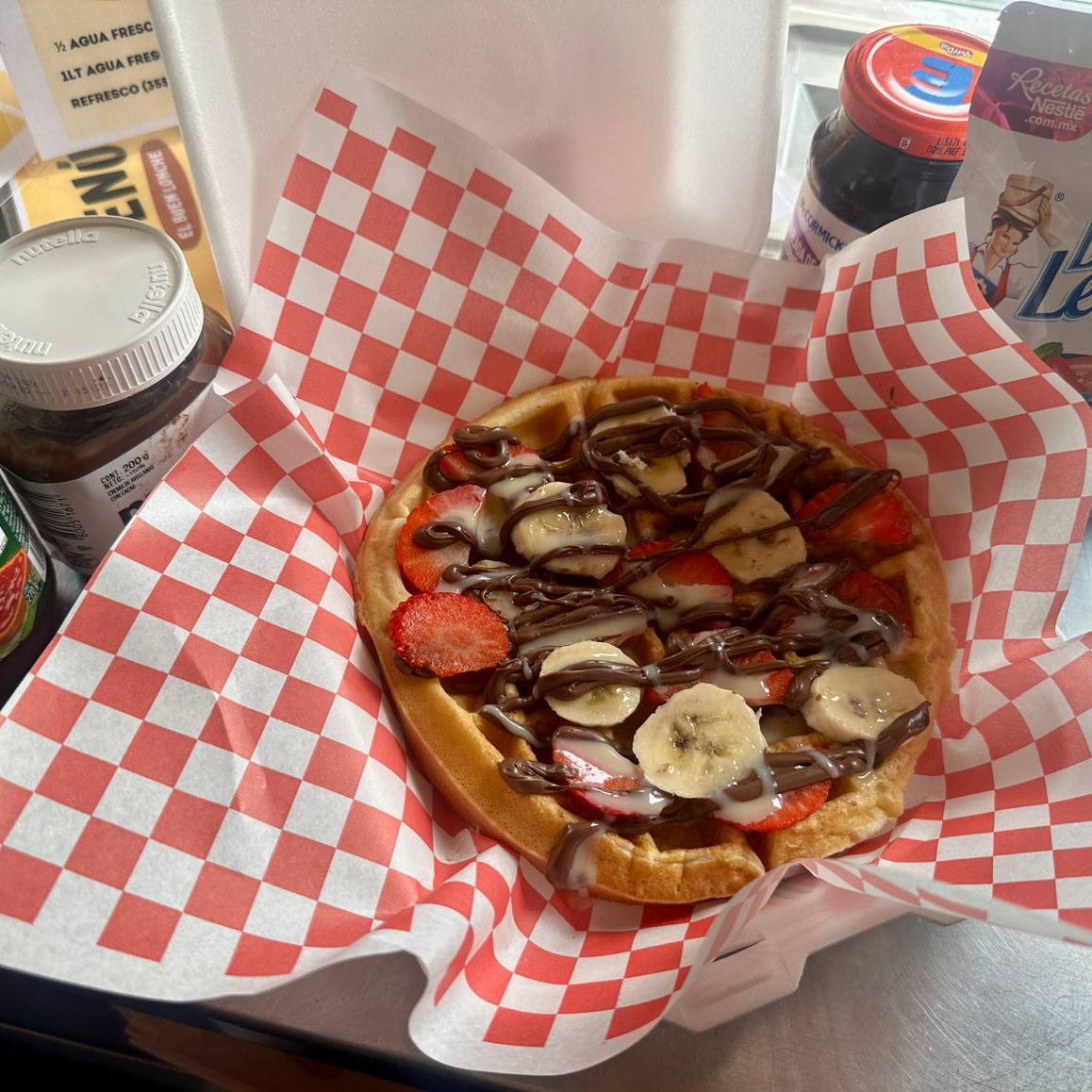 Waffle sencillo (dulce a tu elección, mermelada de fresa, cajeta, lechera o Nutella).