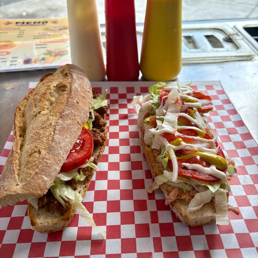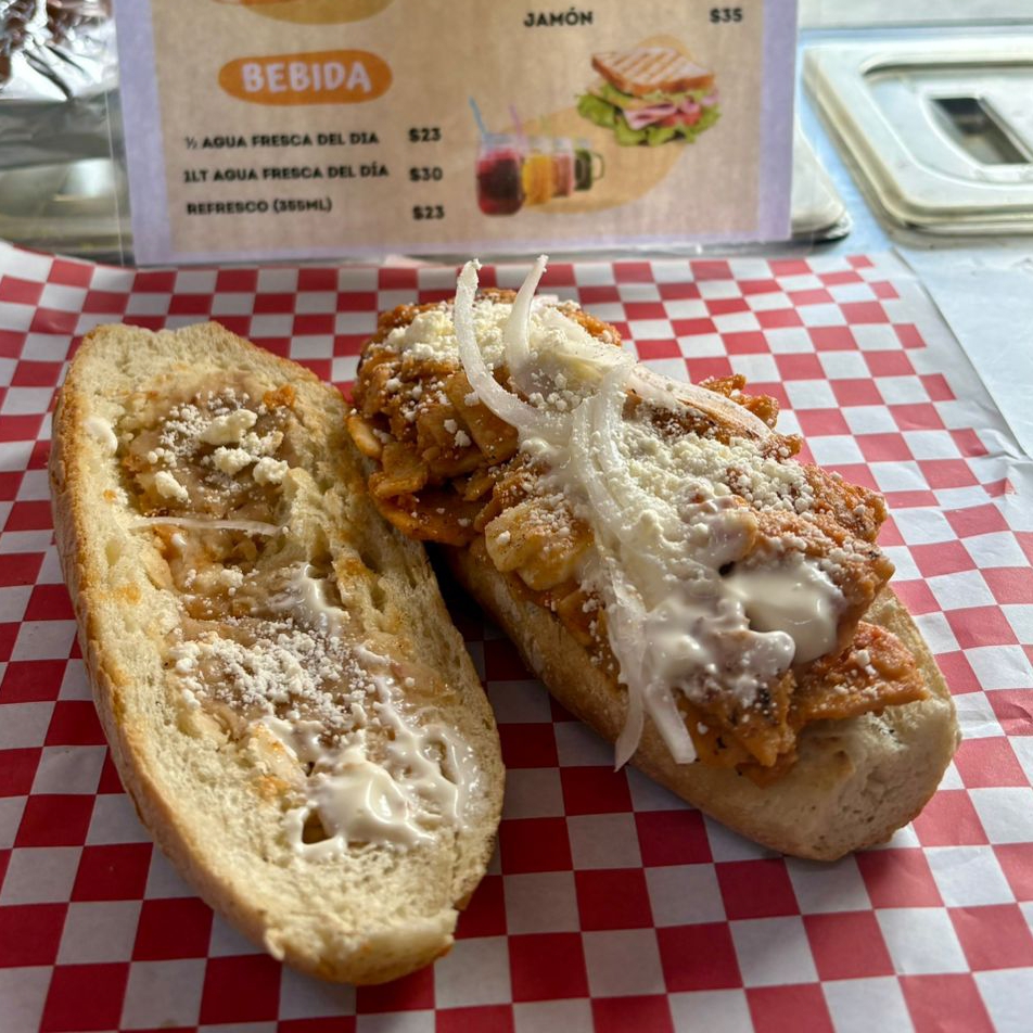 Bolillo calientito, con un aderezo especial de la casa, relleno de pierna y panela, acompañado de lechuga, jitomate, cebolla, crema, catsup y mostaza