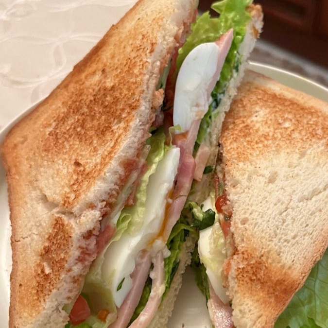 Pan suave relleno de jamón, acompañado de jitomate, cebolla, crema y mostaza.
