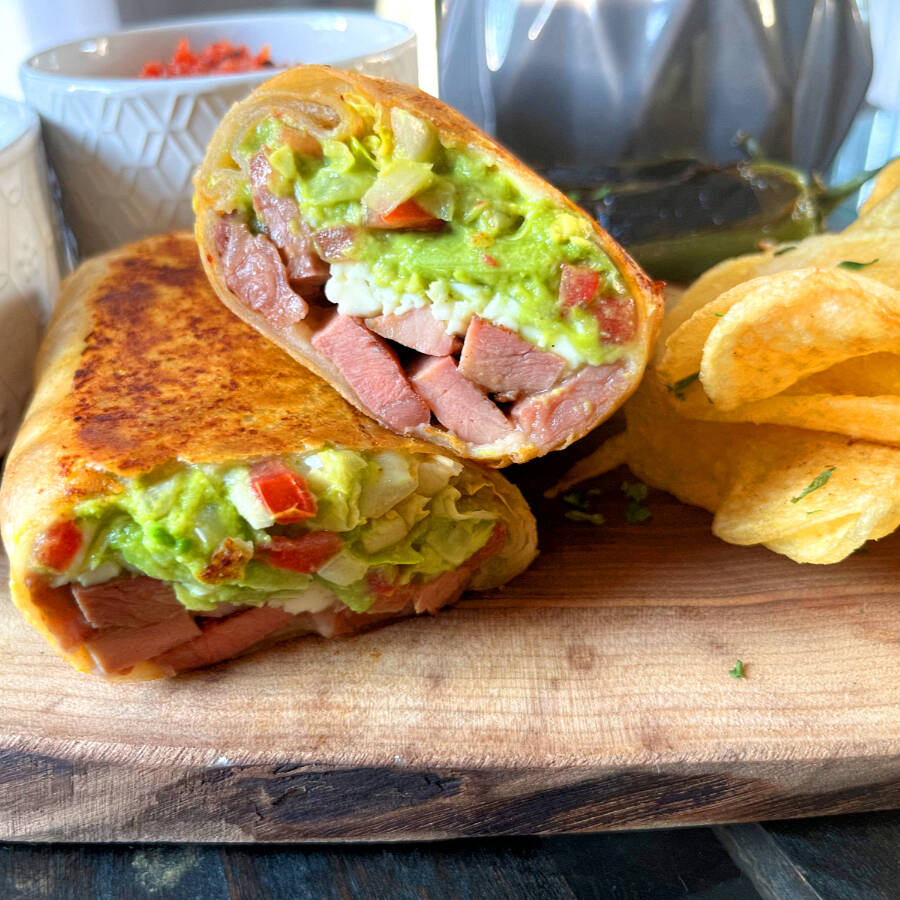 Suadero confitado muy tierno, guacamole artesanal, queso Oaxaca fundido, vegetales frescos y pan artesanal.