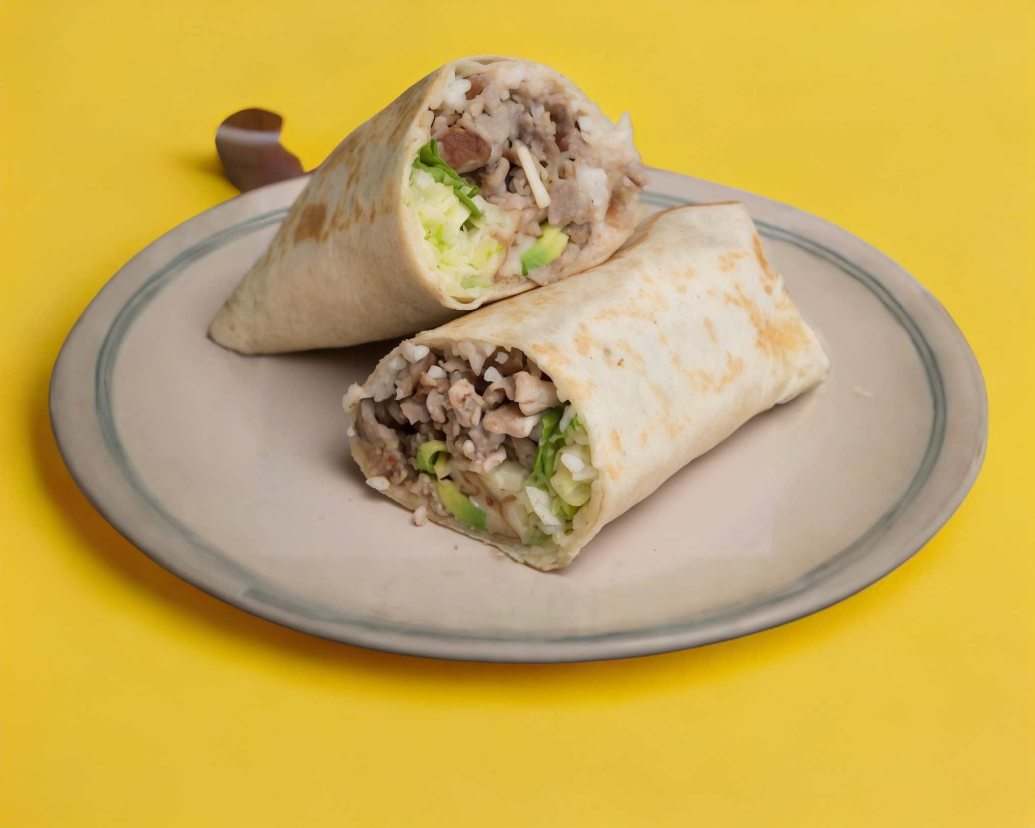 Tortilla de Harina, frijoles, arroz, queso gratinado, chorizo, aguacate y lechuga.