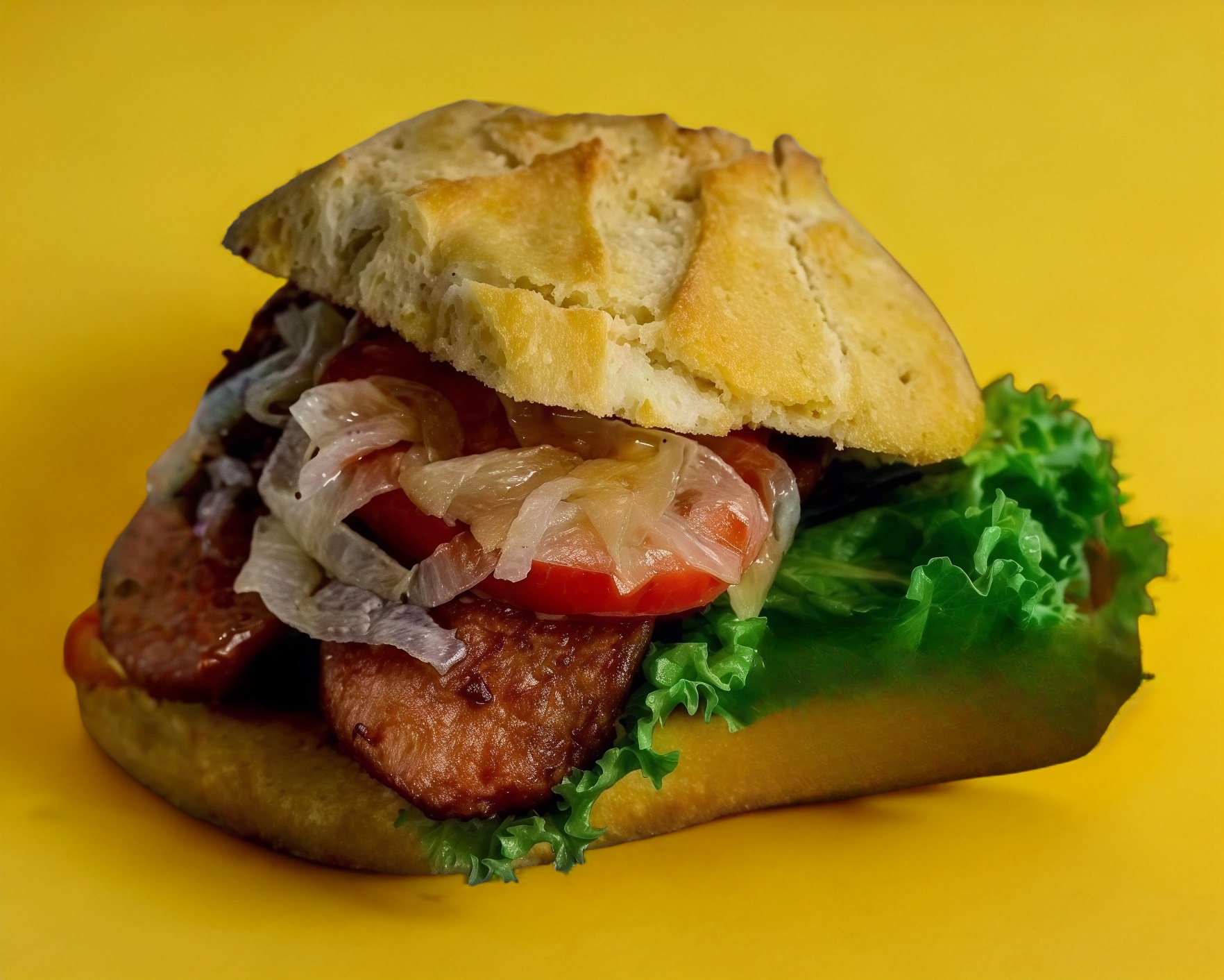 Pan artesanal, chorizo argentino, cebolla caramelizada, tradicional chimichurri y vegetales.