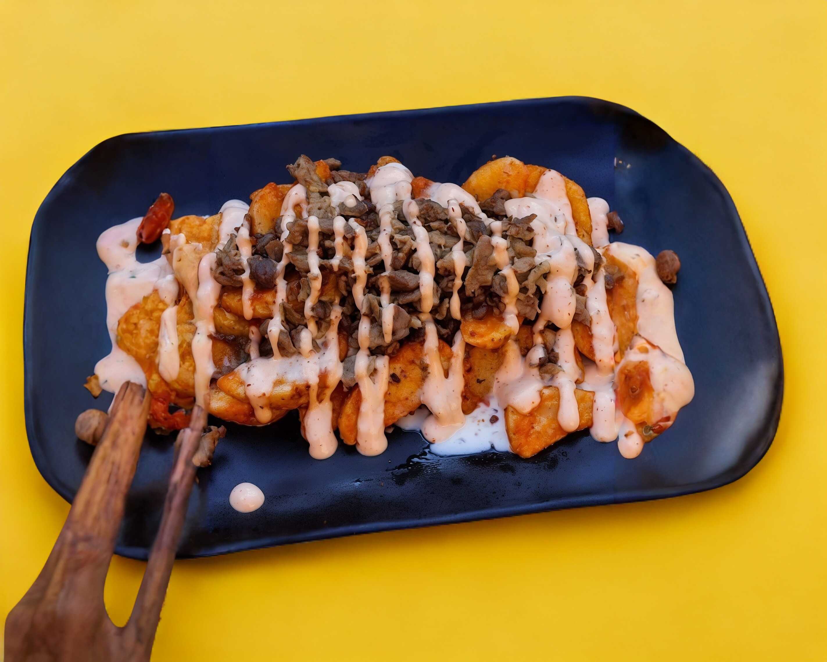 Tortilla 30 cm, frijoles, arroz, carne molida, tocino, papa, cebolla acitronada, queso gratinado y lechuga.