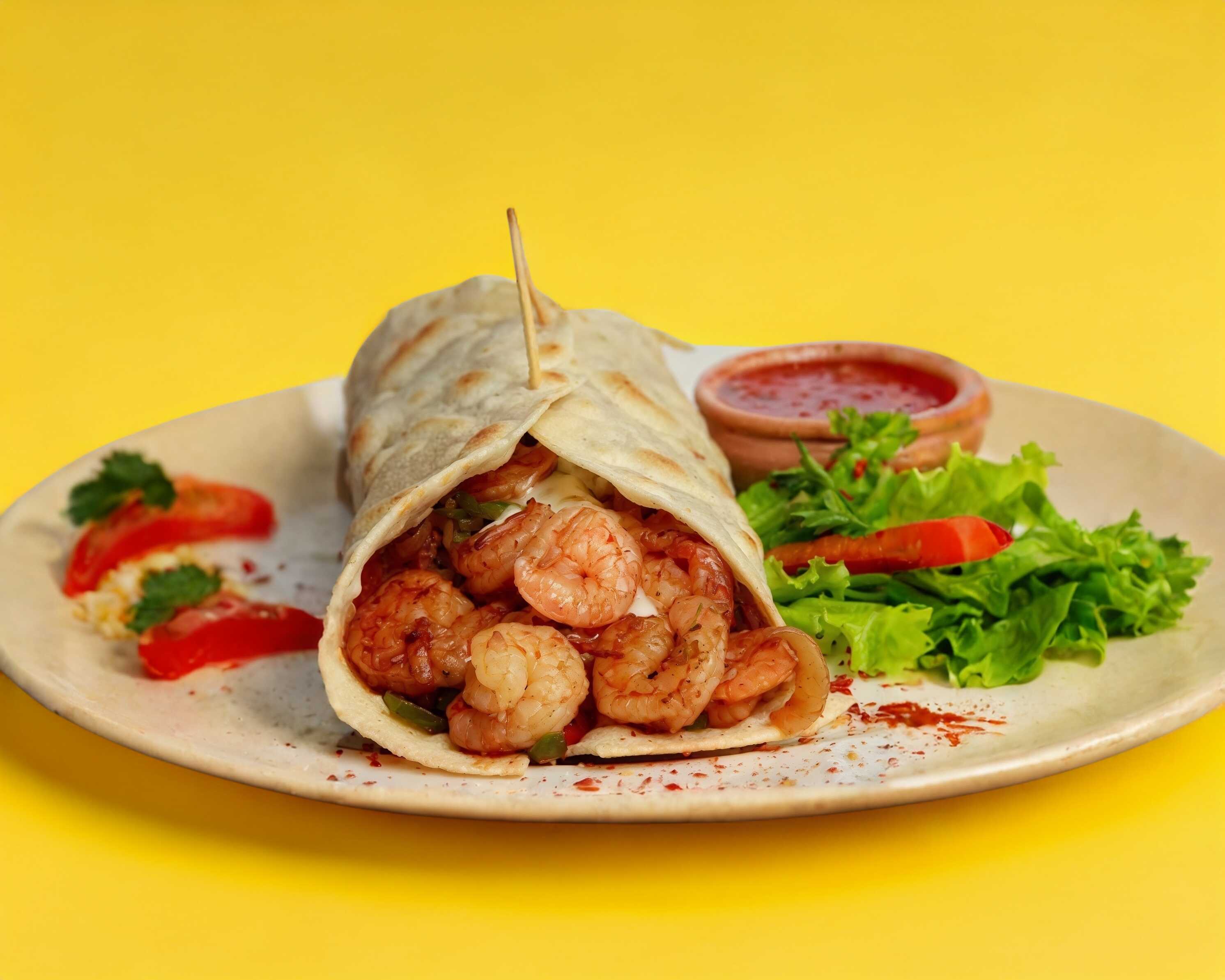 Tortilla 30cm, philadelphia, arroz, camarones a la mantequilla, aguacate, aderezo chipotle, queso gratinado y lechuga