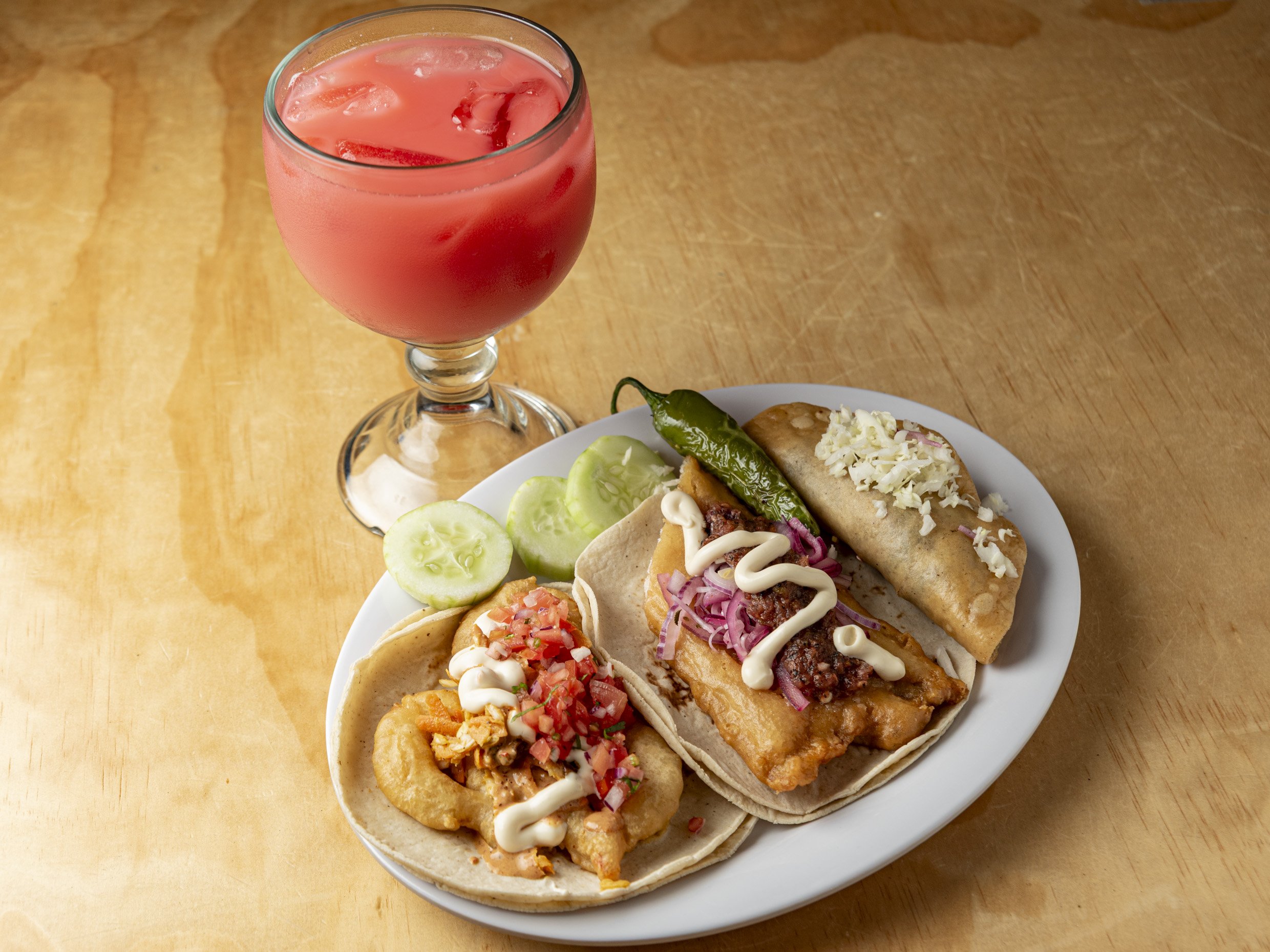 Disfruta de 3 tacos de tu elección, con los ingredientes y salsas que más te gusten, acompañados de una agua fresca de 500 ml en botella, para refrescarte mientras saboreas cada taco.