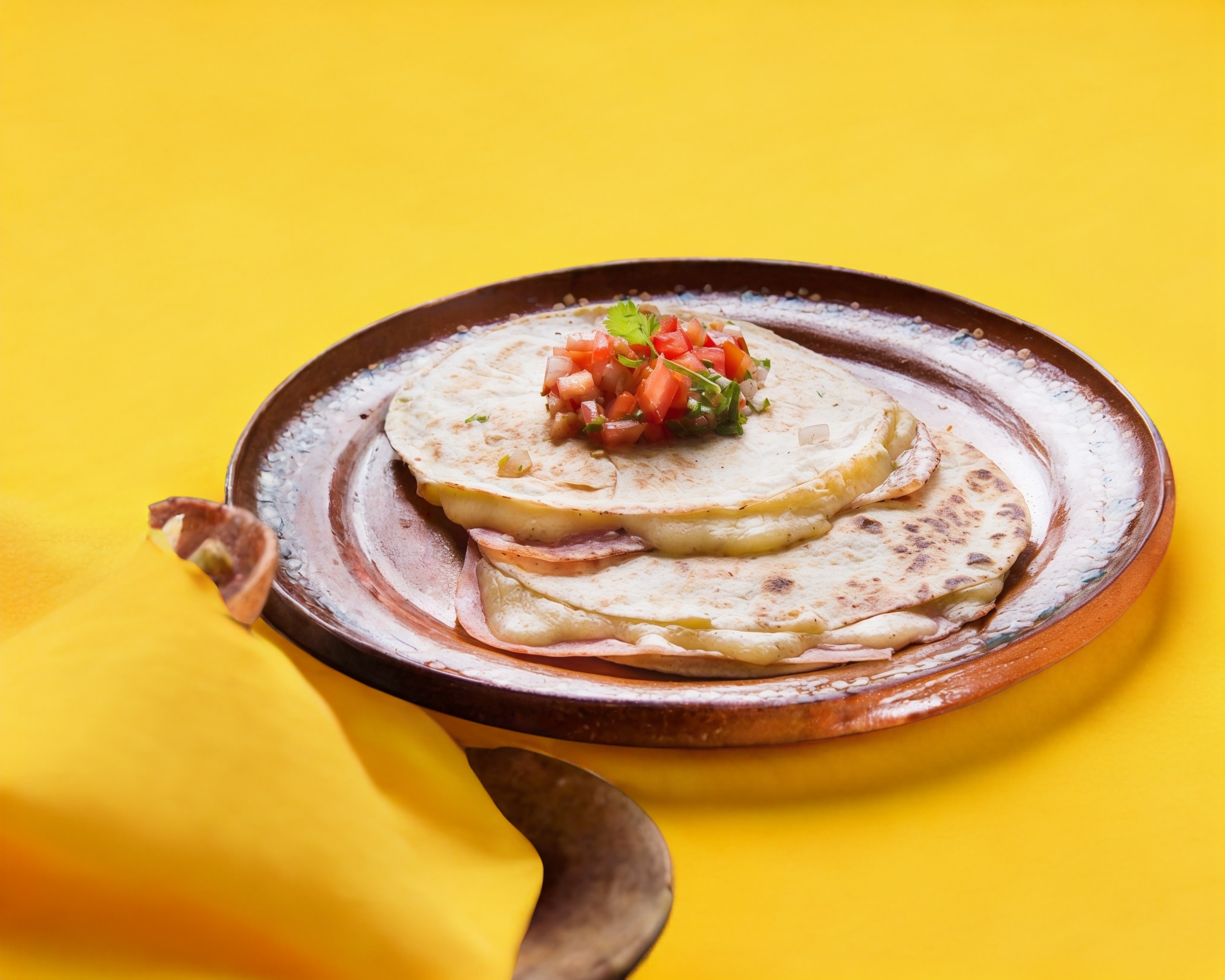 Tortilla de harina grande aprox. 30 cm. Con queso mozarella, bistec, chorizo, tocino, jamón, cebolla guisada, con chile de tomate y salsa verde