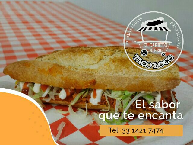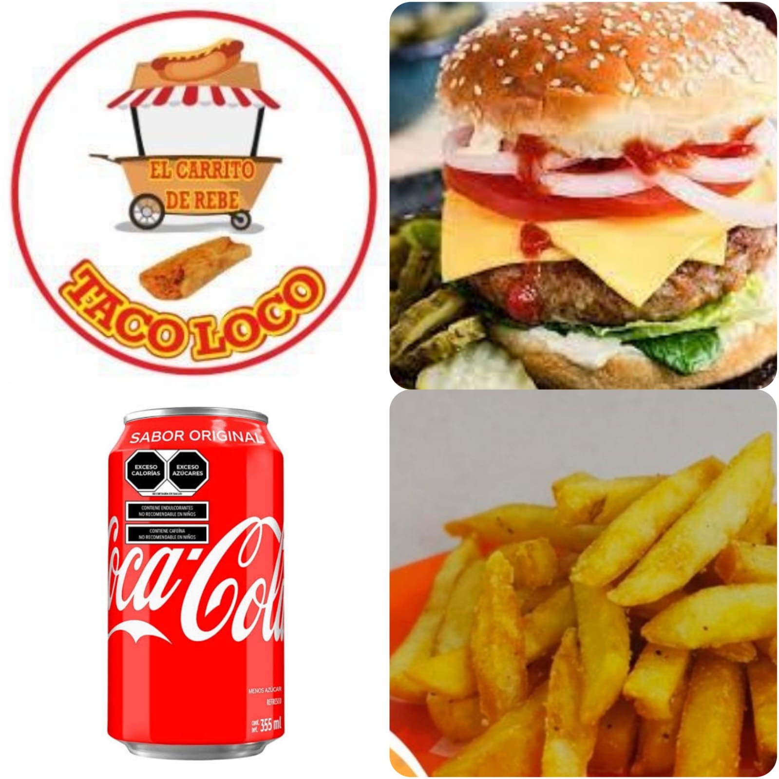 Carne de res, con queso amarillo, lechuga, jitomate, cebolla, crema, cátsup, mostaza, chile, pepinillos, zanahoria, jalapeños y guarnición de papas a la francesa