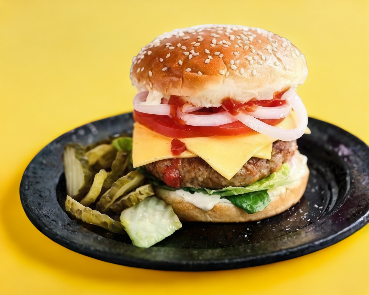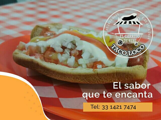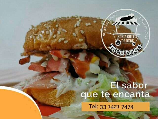 Carne de res,con queso amarillo,lechuga,jitomate,cebolla,crema,catsup y mostaza