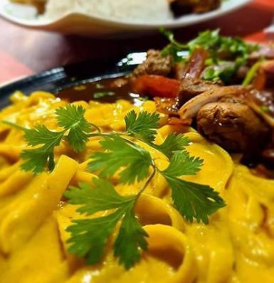Filete de res salteado con cebolla, jitomate, cilantro, especias, acompañado fetuchini en aderezo de huancaína con queso parmesano.
