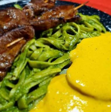 Fetuchini en salsa especia a base de espinaca y albaca, acompañada de papá a la huancaína y anticuchos.