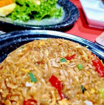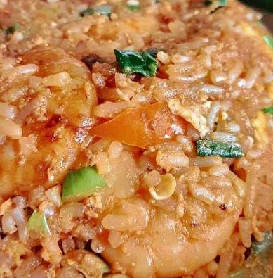 Arroz frito con cebolla china, pimiento y con mariscos.