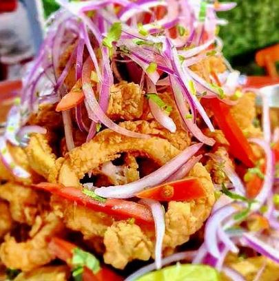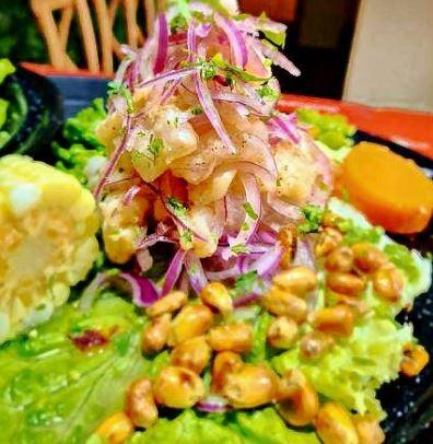 Pescado picado curtido con limón, rocoto peruano, especias acompañado de papa, camote, elote cocido, cancha, maíz frito peruano, chifle, cebolla, cilantro y mariscos empanizado frito.