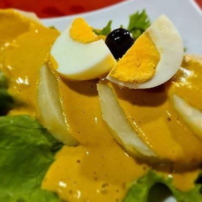 Papa cocida cubierta en salsa elaborada con chile peruano escabeche, acompañada de huevo cocido y aceituna.