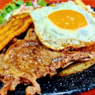 Chuleta de res a la parrilla, acompañado de papas fritas, arroz blanco, huevo estrellado, plátano asado y ensalada fresca.