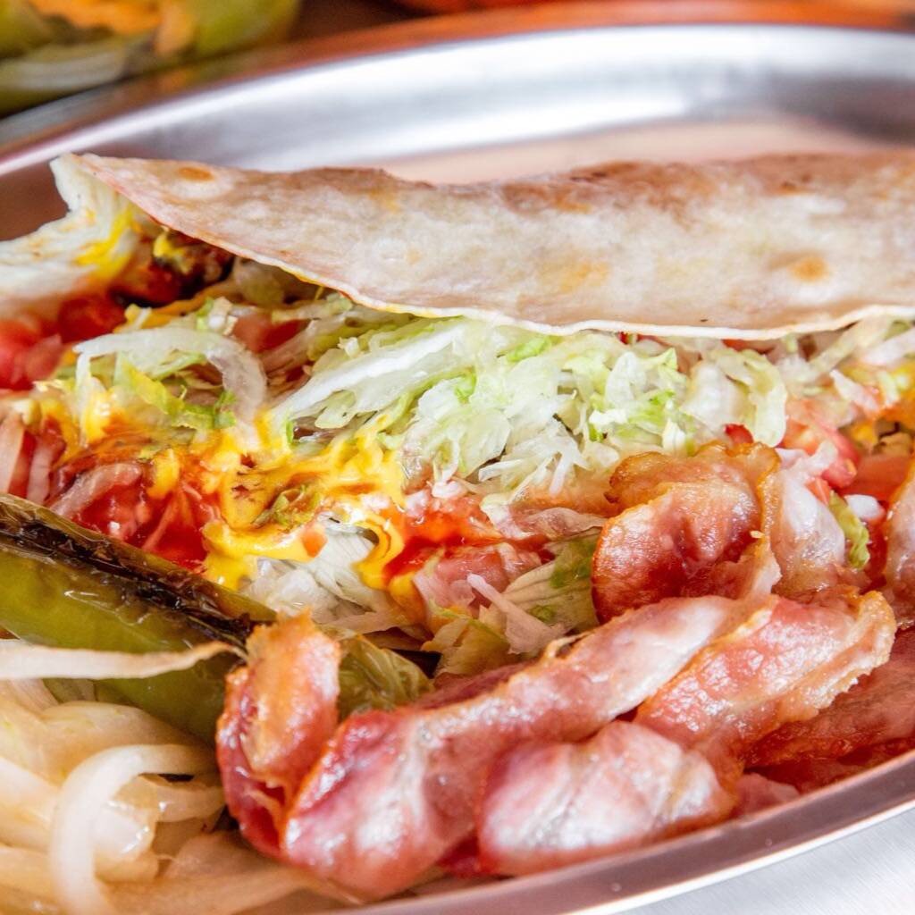 Carne de res, camarón, tocino, queso blanco, jitomate, lechuga, cebolla, mostaza, crema y cátsup.