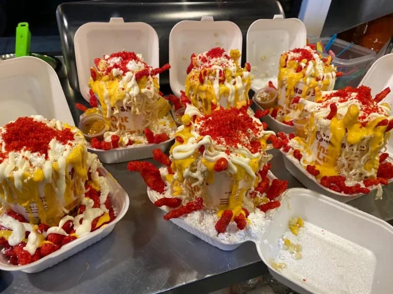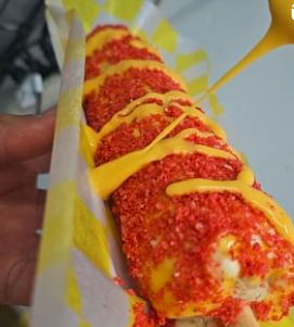 Elote de queso amarillo y topping de papitas.