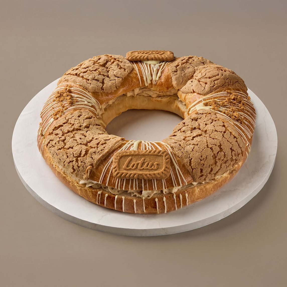 Rosca de reyes elaborada a partir de una masa con mantequilla, en donde se aprecian pequeños trozos de cáscara de naranja confitada. Rellena con deliciosa crema con galleta Lotus, decorada con chocolate blanco, galleta Lotus en polvo, y 2 galletas Lotus enteras.
