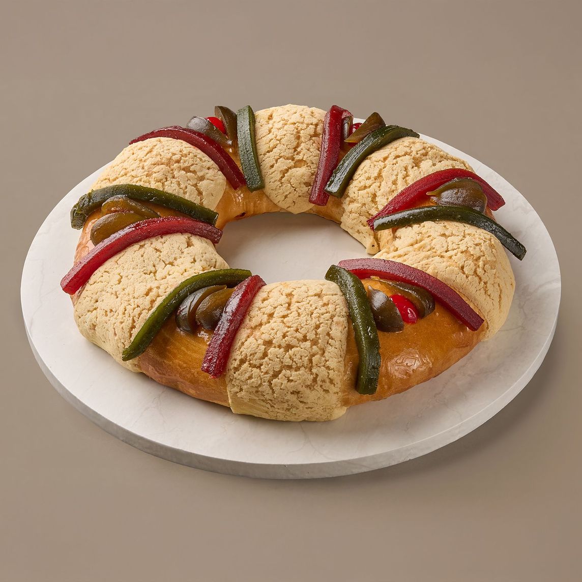 Deliciosa Rosca de reyes tradicional elaborada con una masa rica en mantequilla, con pequeños trozos de cáscara de naranja. Decorada con ate en tiras de colores (verde y rojo), frutas confitadas (cereza e higo) y galleta dorada.