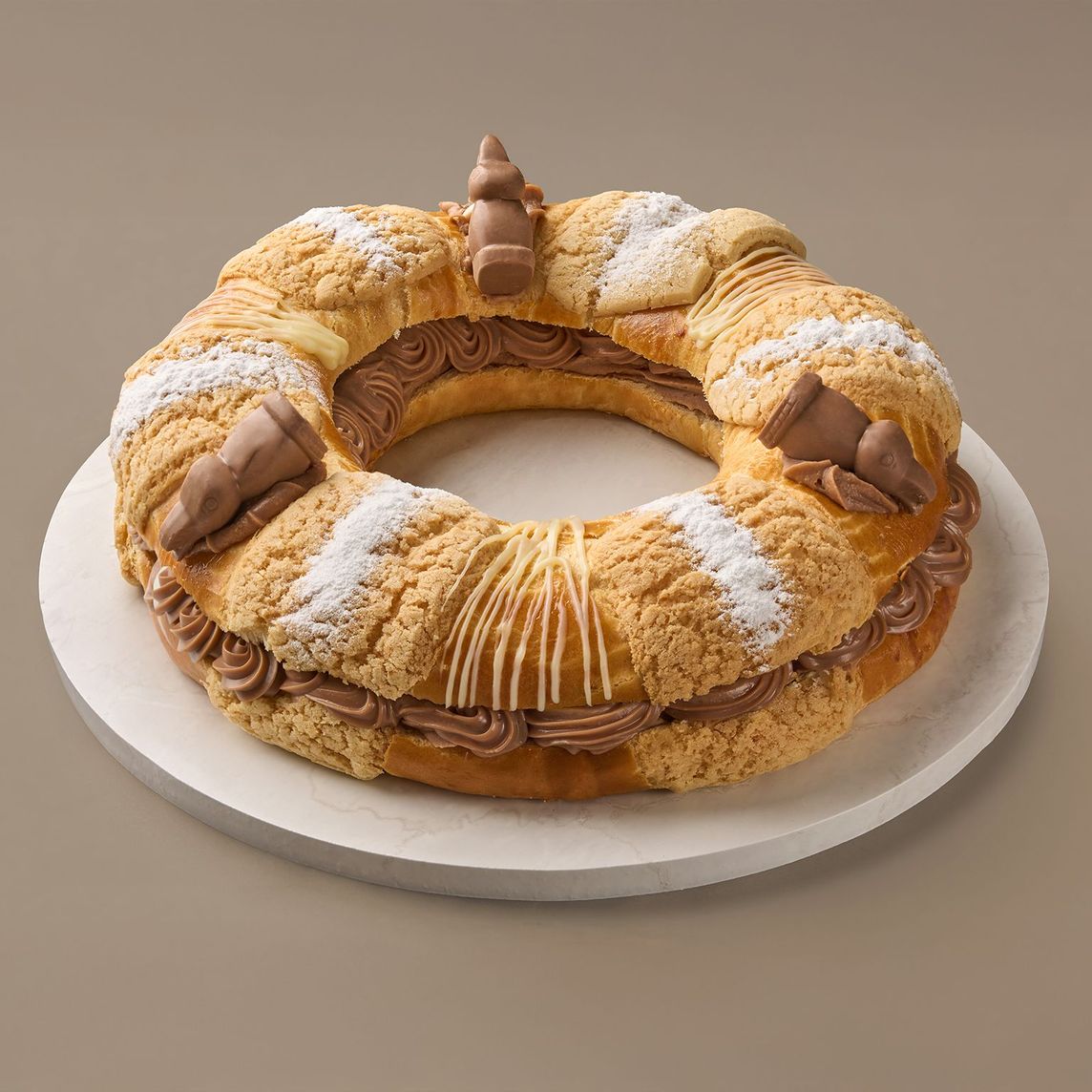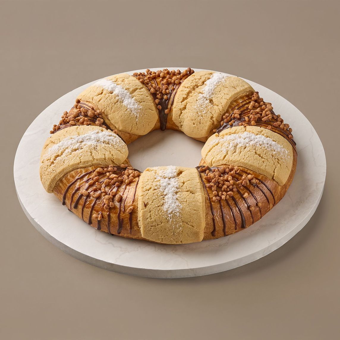 Rosca de reyes rellena de chocolate semi-amargo. Elaborada con una masa rica en mantequilla, con pequeños trozos de cáscara de naranja. Decorado con líneas de chocolate, galleta, almendra confitada y azúcar glass.