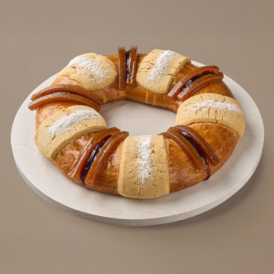 Rosca tradicional elaborada a partir de una masa 100% mantequilla, de miga suave, húmeda y esponjosa con pequeños trozos de cáscara de naranja confitada. Con intenso sabor a mantequilla, rellena con auténtico brownie doble chocolate. Decorada con cuadros de brownie y rayada con ganache de chocolate amargo y una ligera capa de azúcar glas sobre las galletas de azúcar