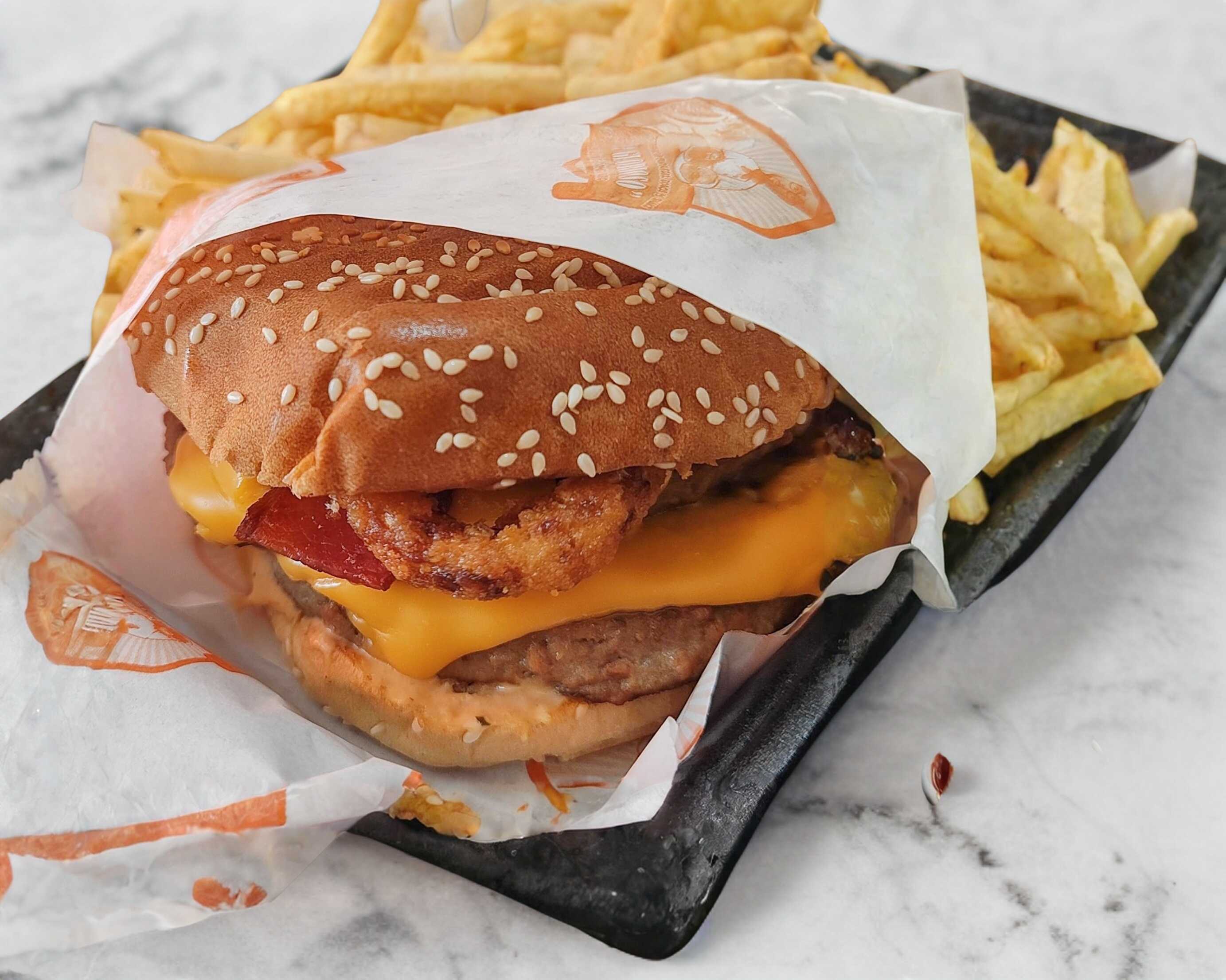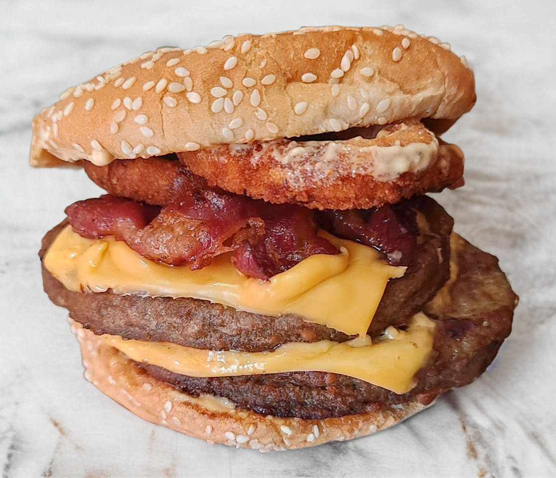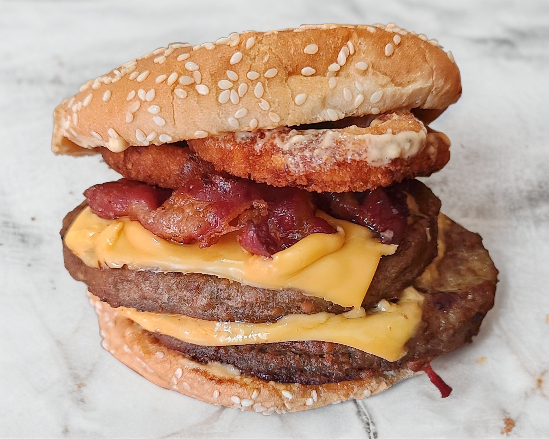 Doble carne de res, queso, aros de cebolla, tocino y aderezo chipotle.