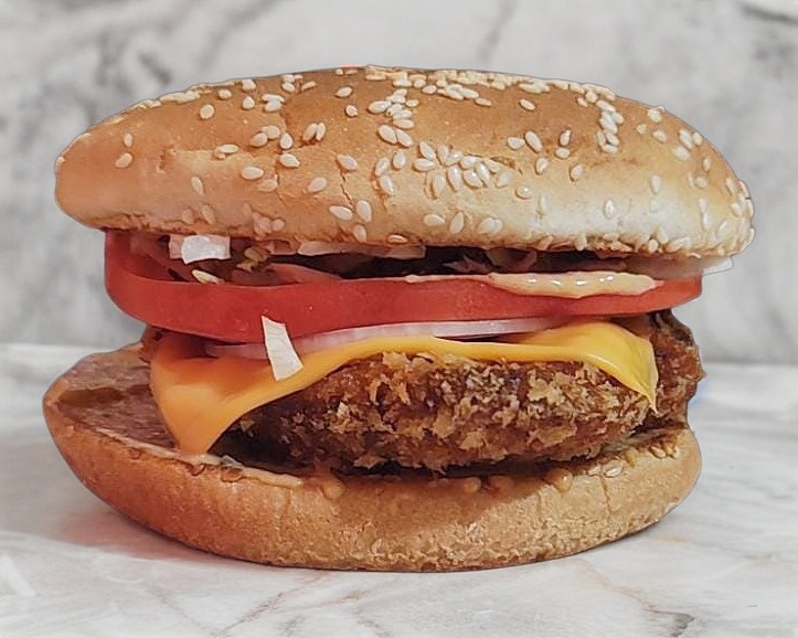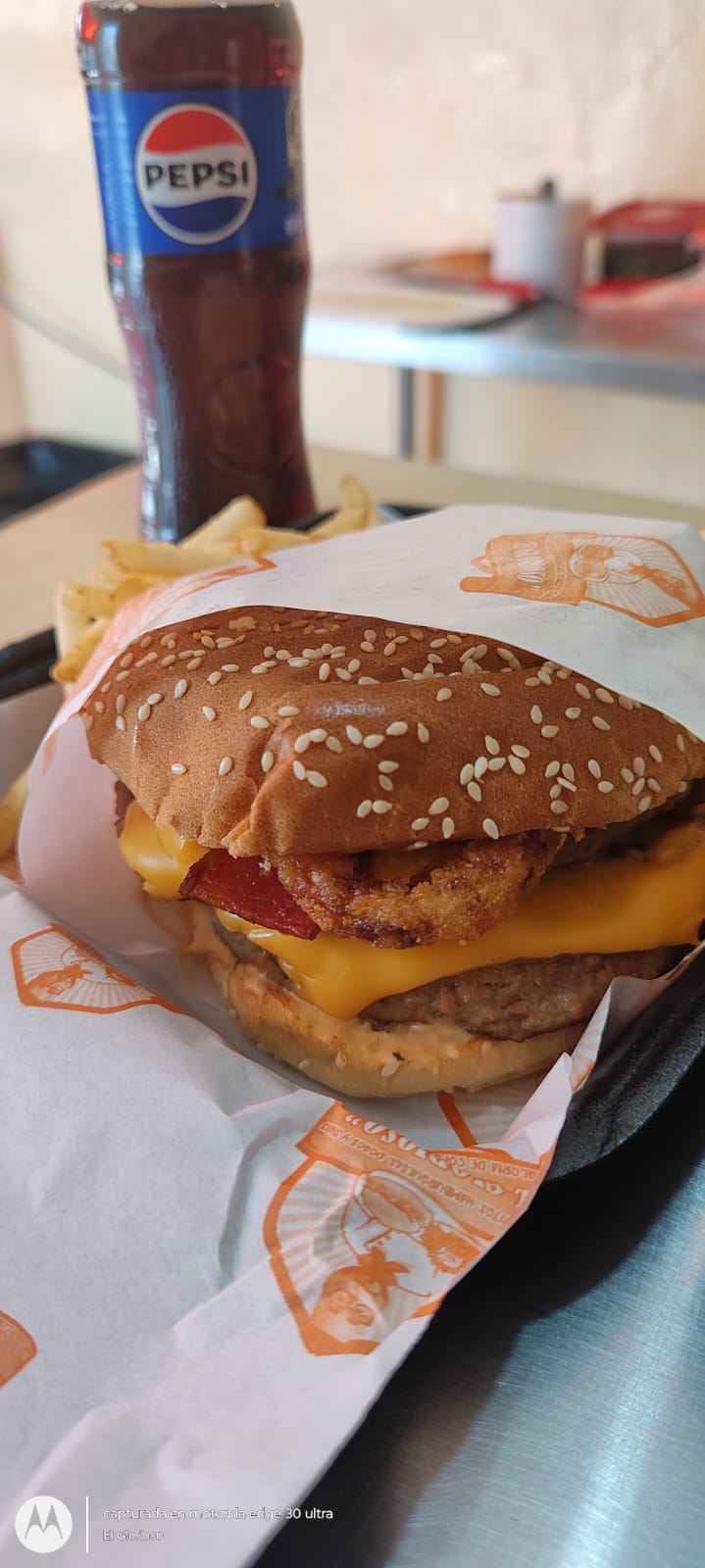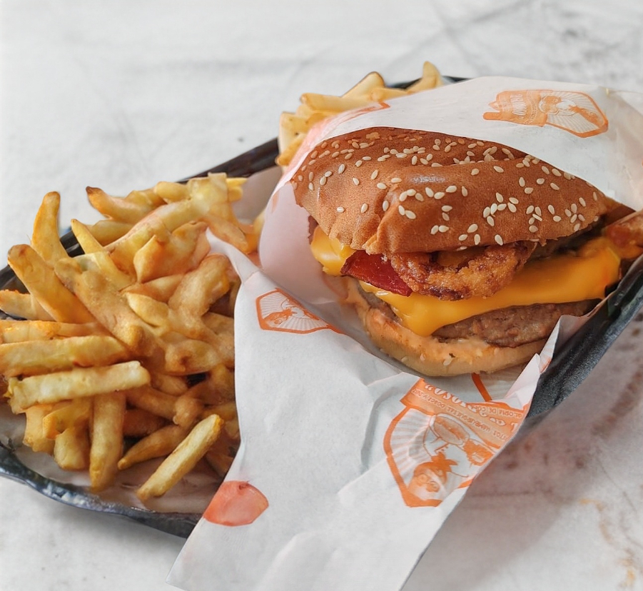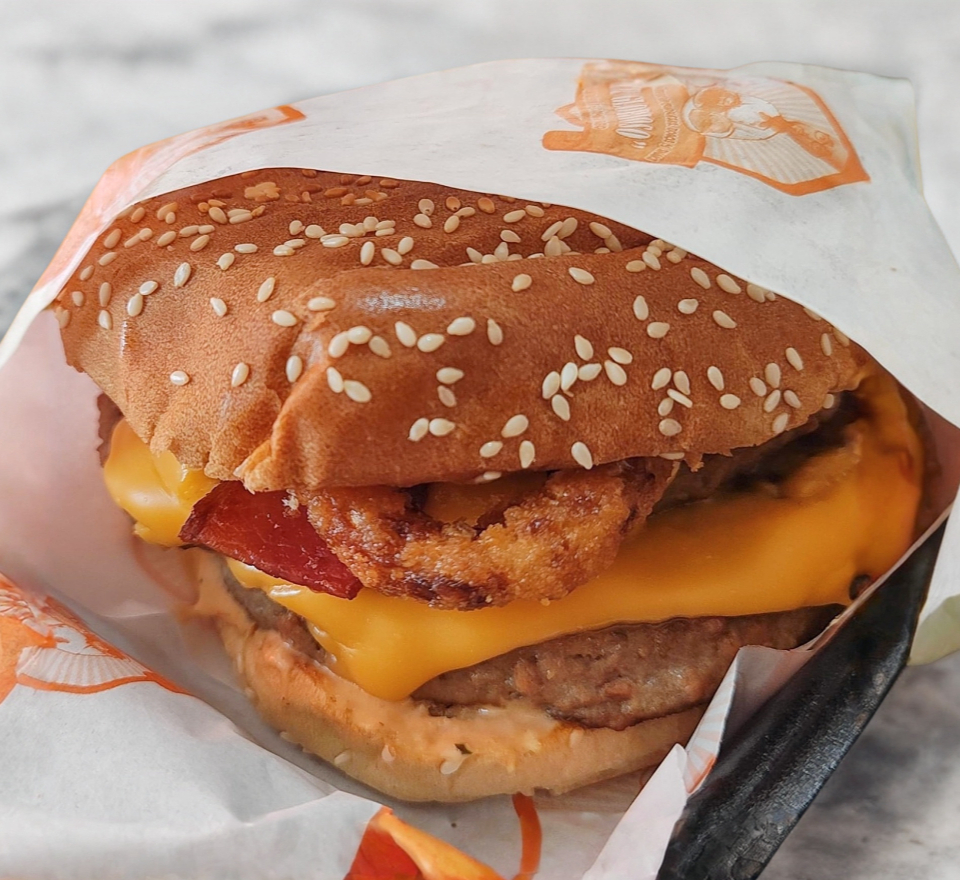 Doble carne de res, queso, aros de cebolla, tocino y aderezo chipotle.