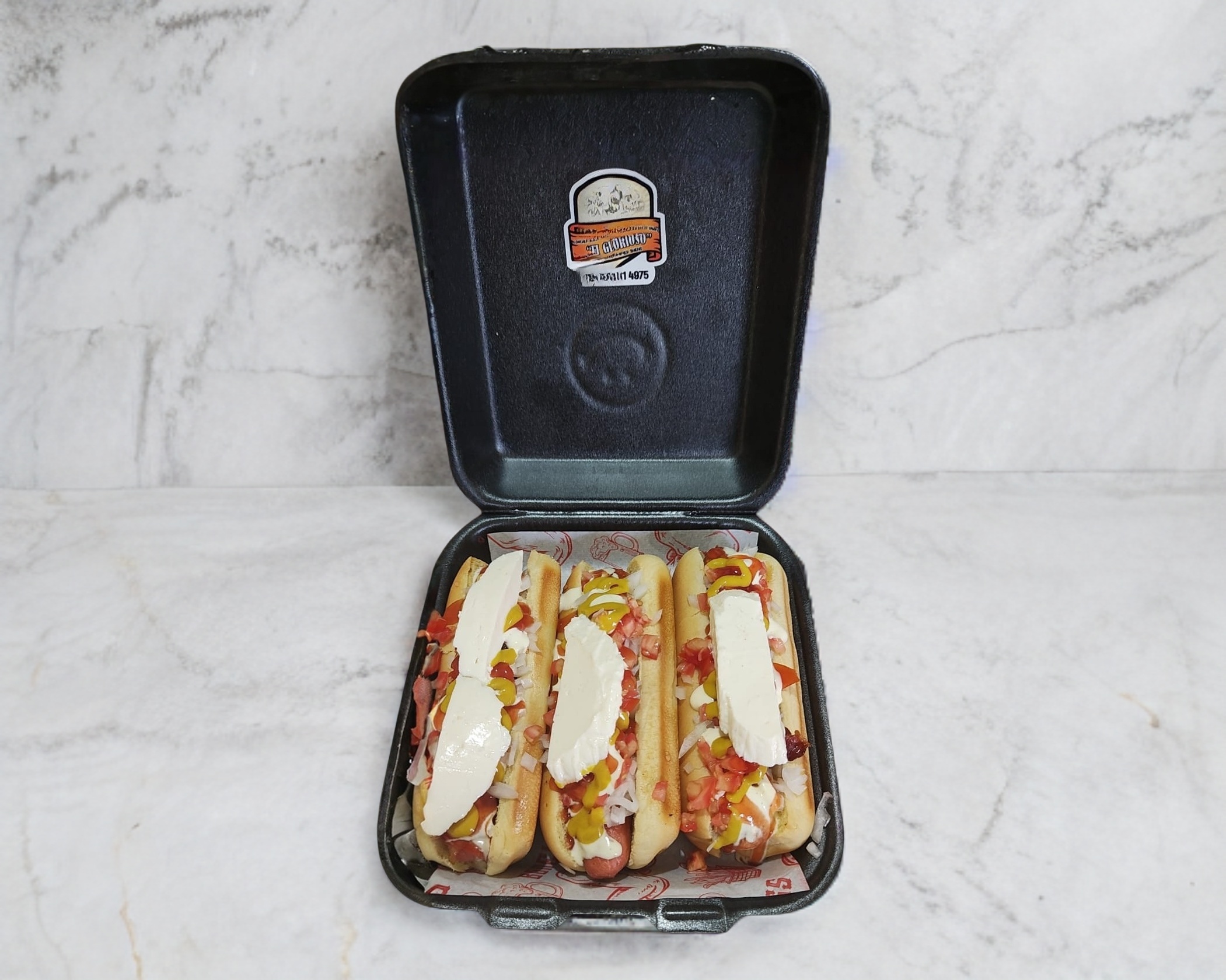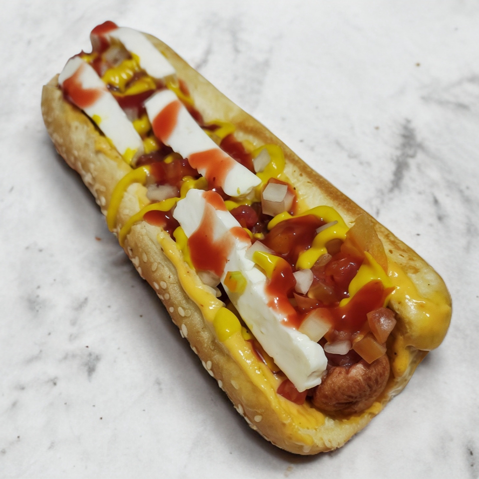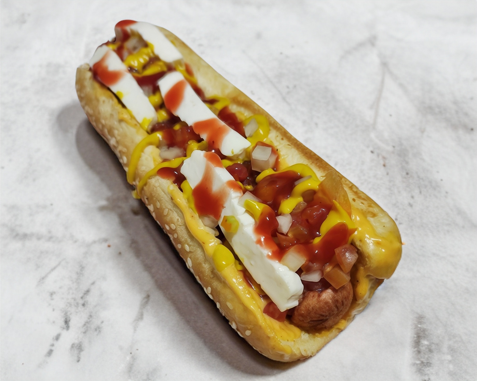 Salchicha especial con tocino, jitomate, cebolla, jalapeño, panela y aderezos al gusto.