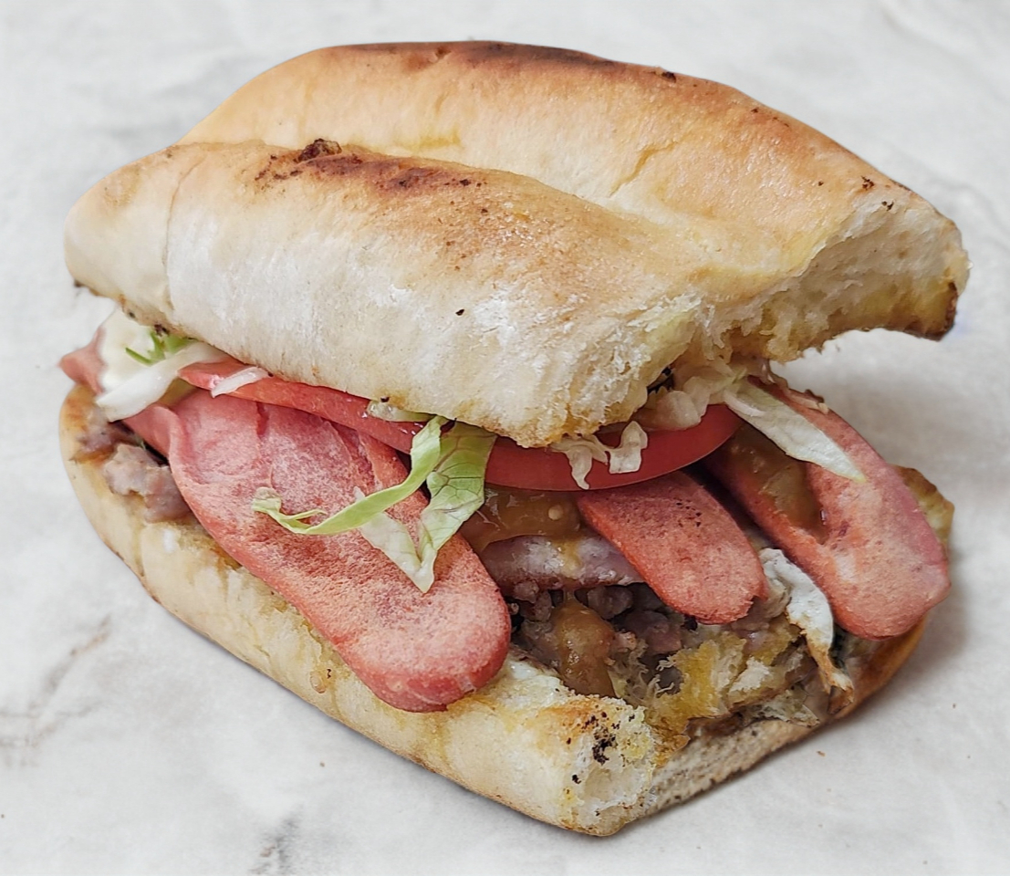 Pierna gloriosa, lechuga, jitomate, cebolla, aguacate, jamón, salchicha y queso manchego.