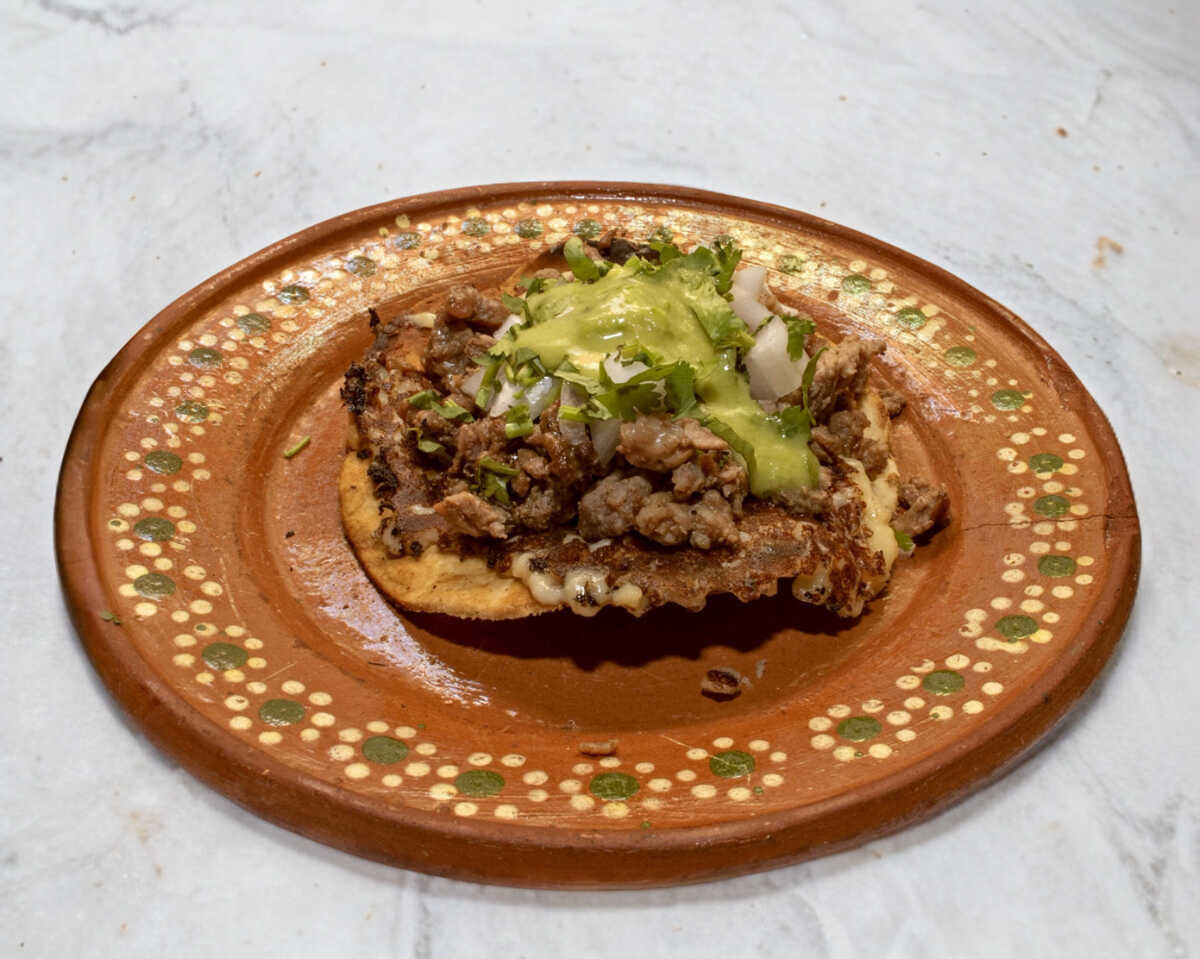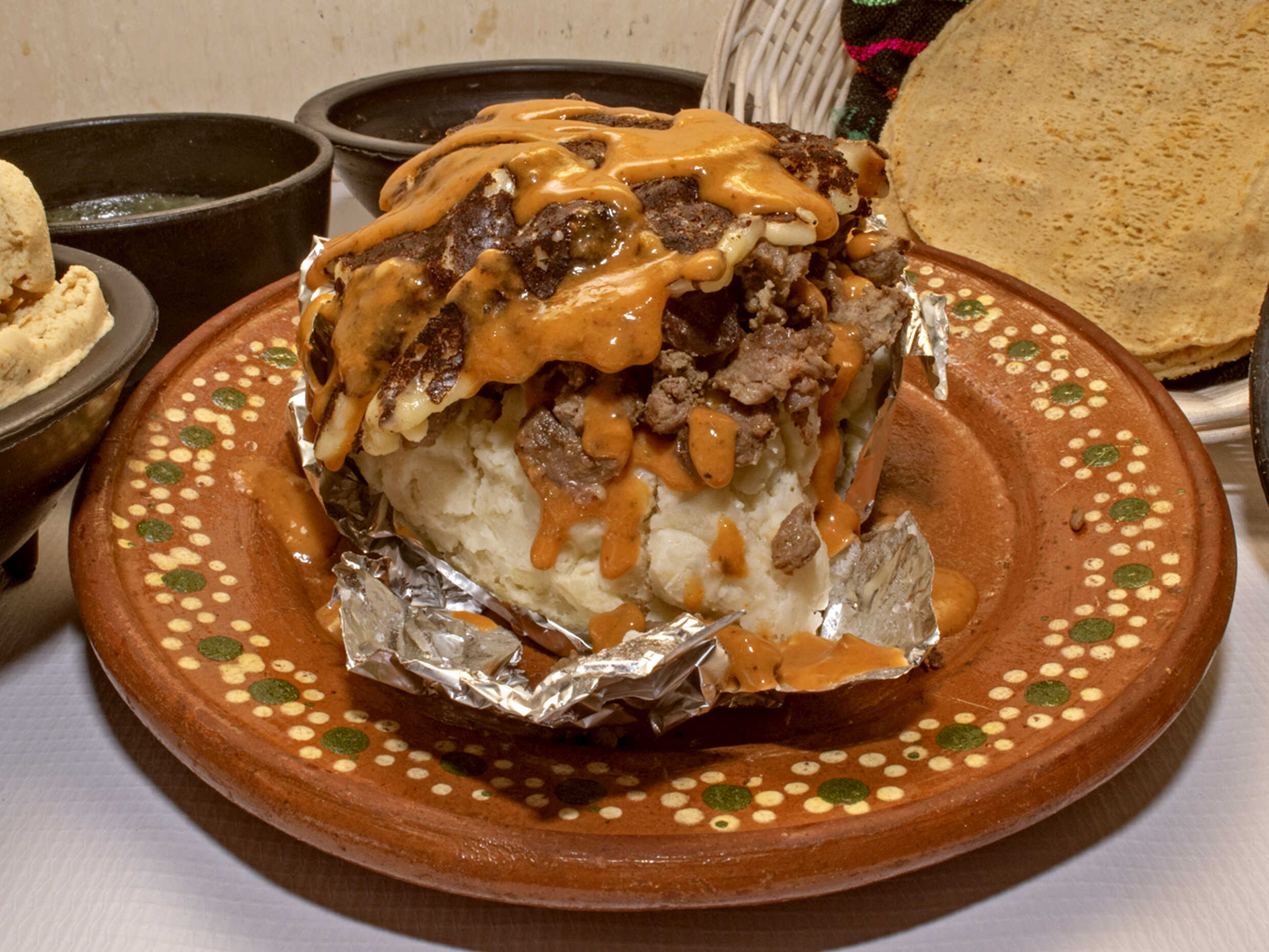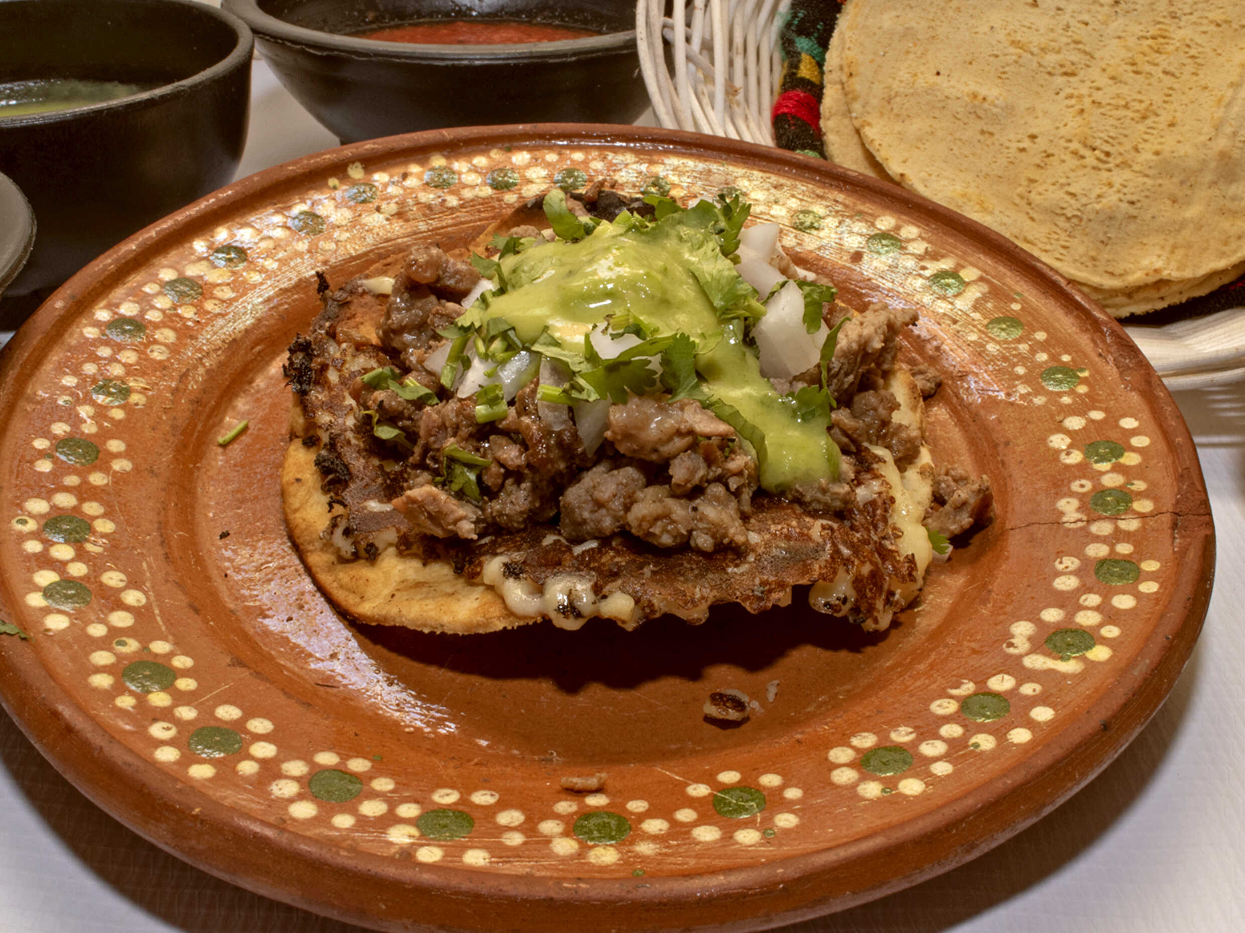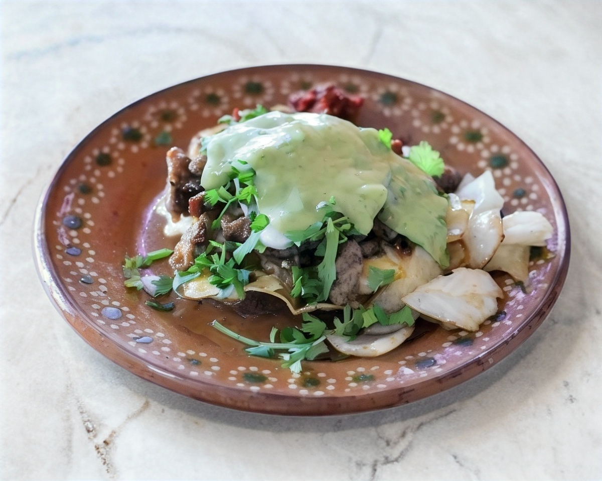 Platillo personal / Preparado con suave y jugosa arrachera, acompañado de cilantro fresco, cebolla picada y una cremosa salsa de aguacate. Además, lleva queso fundido derretido y una capa de frijoles que realzan su sabor.